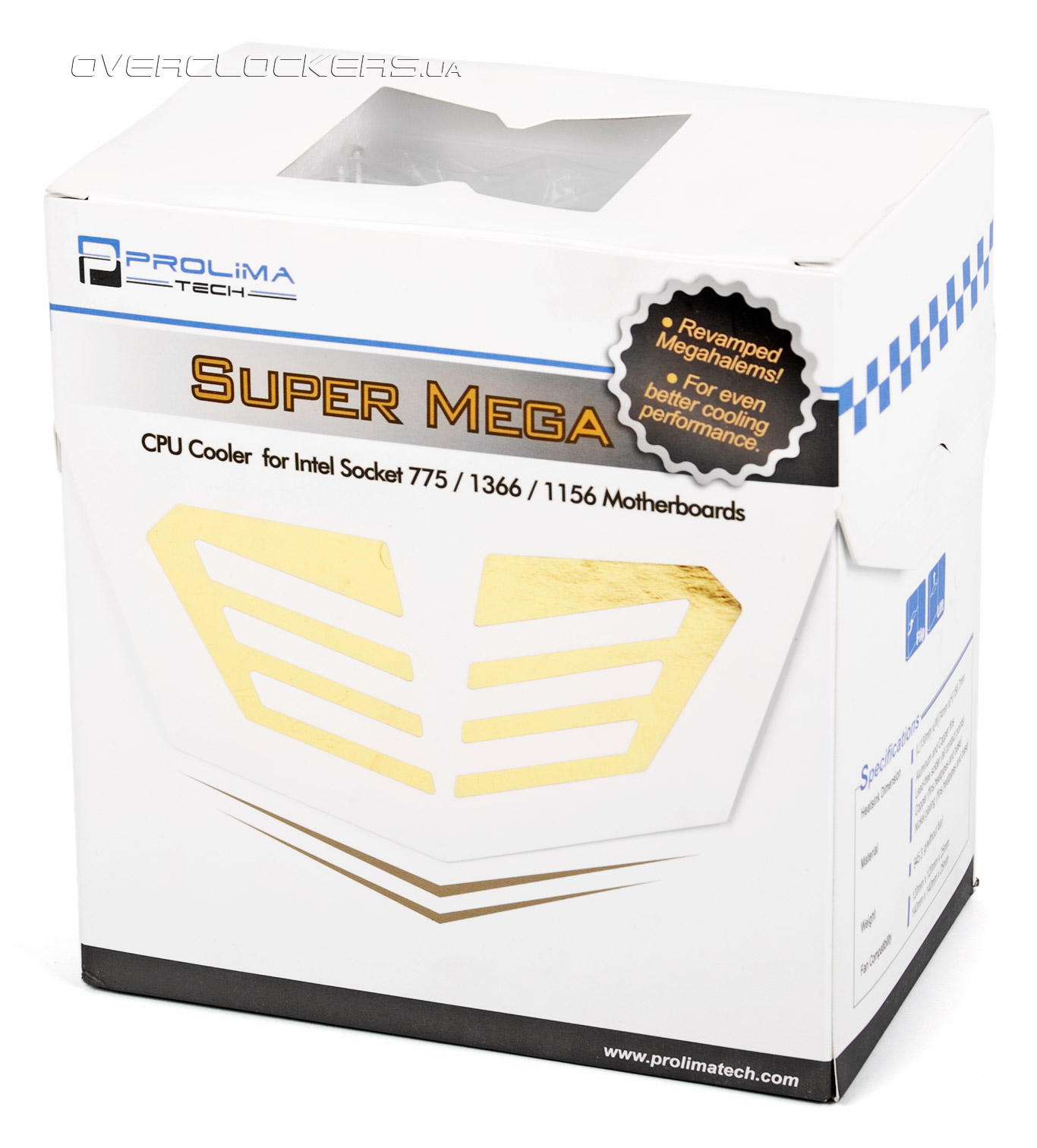Продукт поставляется в небольшой белой коробке. Вверху упаковки есть небольшое окошко, через которое видно часть радиатора. На лицевой стороне коробки присутствует название и ярлычок, свидетельствующий о том, что данный кулер является новой ревизией Megahalems, а на боковой — приведены краткие спецификации. Радиатор надежно защищён от повреждений пенополиуретановым уплотнителем.