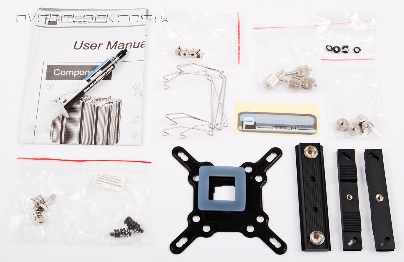 В комплекте с радиатором не поставляется вентилятор. Пользователю предоставляется возможность самостоятельно выбрать и приобрести нужную «вертушку». Или сразу две — благо конструкция радиатора позволяет установить вентиляторы с обеих сторон. Комплект поставки включает следующие аксессуары: