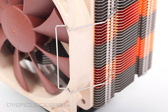 Крепятся вентиляторы специальными стальными скобами, причём не за монтажные отверстия, как это было ранее у старых ревизий Megahalems, а непосредственно за корпус. Такой подход позволяет без проблем устанавливать модули памяти с высоким радиатором при близком расположении слотов DIMM к процессорному кулеру.