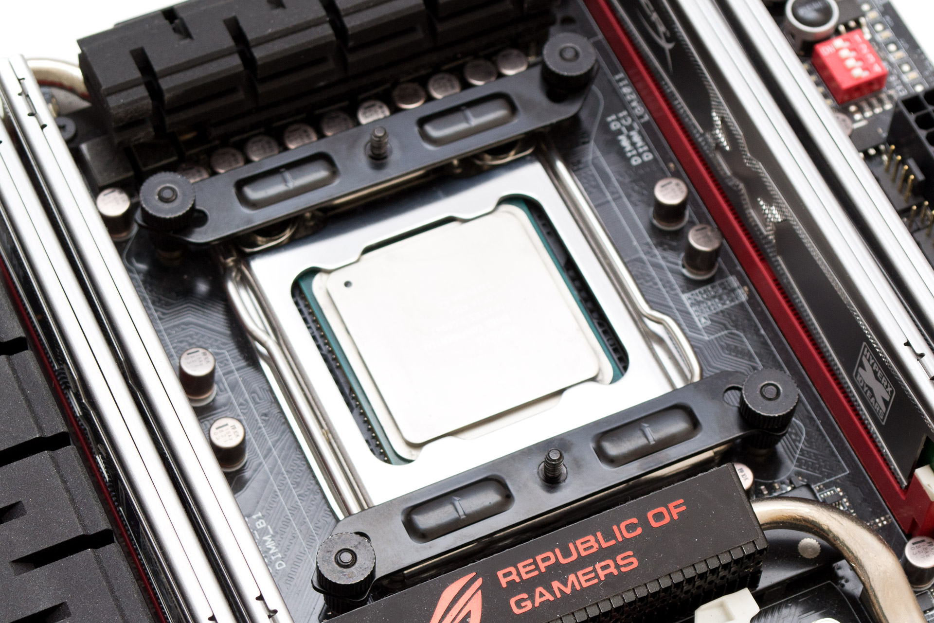 Для теста эффективности Qube QB-OL2000GT использовалась платформа Intel LGA2011 с процессором Intel Core i7-4960X. Кулер поддерживает большинство актуальных разъемов, а его монтаж (особенно на данном сокете) происходит очень просто. Сначала винтовые стойки прикручиваются в соответствующие отверстия.