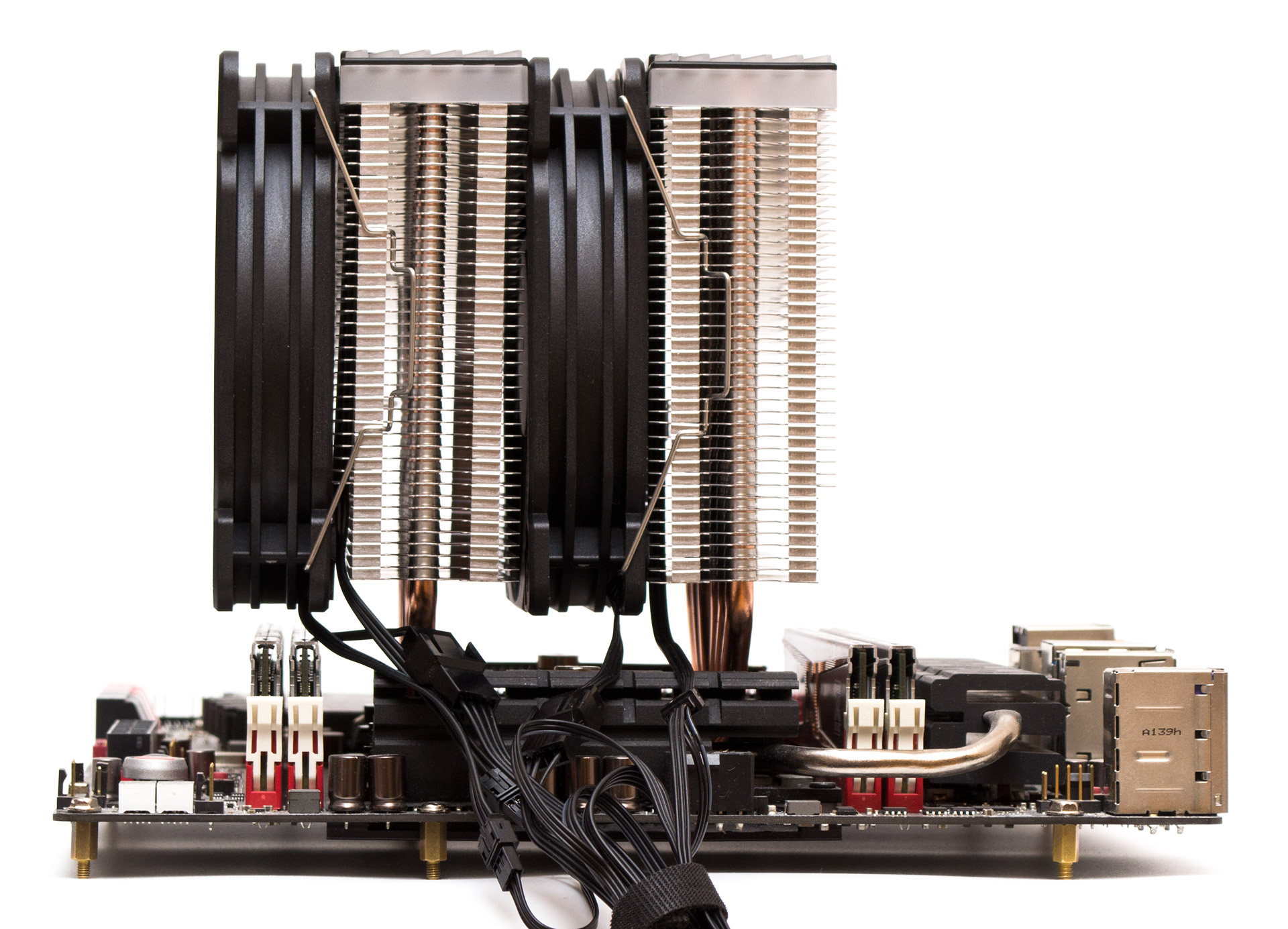 | Материал радиатора и конструкция | Двухбашенная конструкция из алюминиевых пластин, нанизанных на 6 медных тепловых трубок, диаметром 6 мм, расставленных U-образно. Кулер имеет основание прямого контакта. |