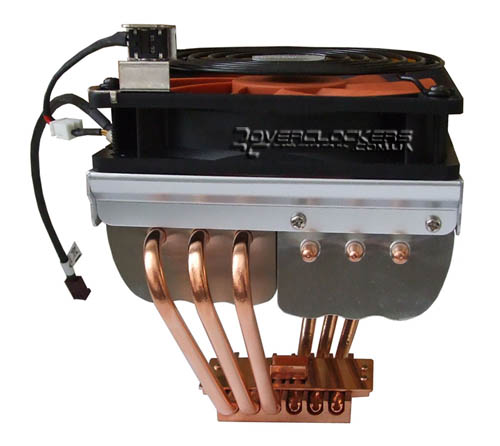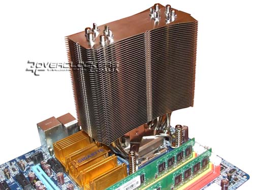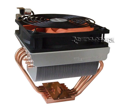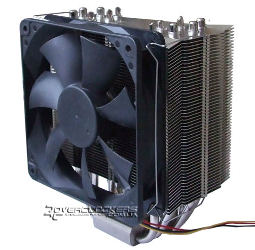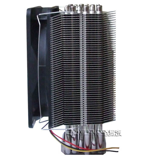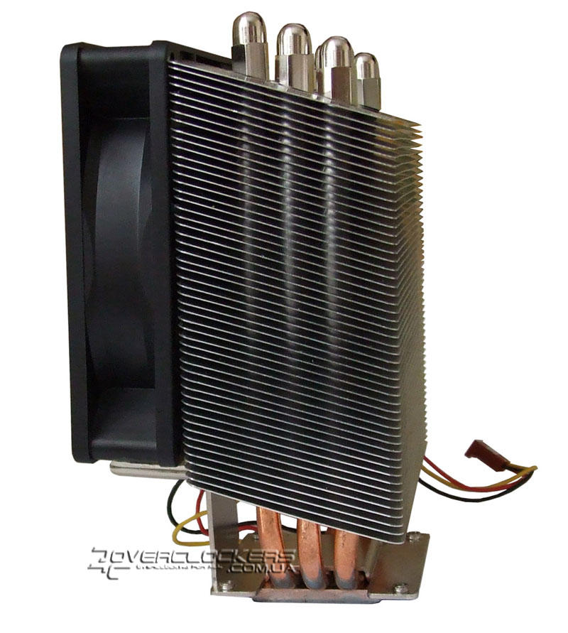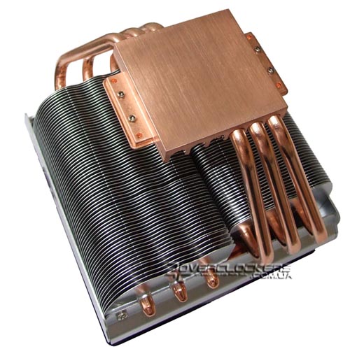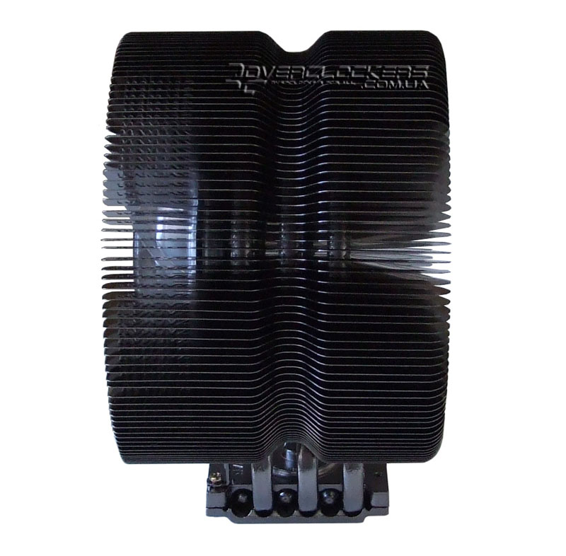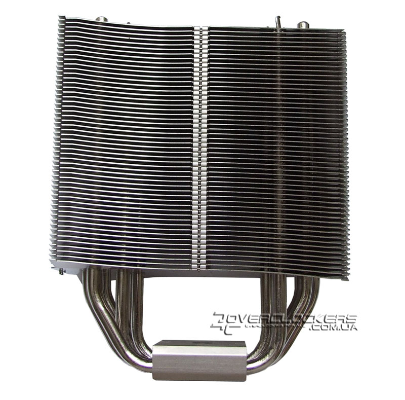 На изогнутые тепловые трубки, выходящие из медного основания, нанизаны алюминиевые ребра радиатора. Сам радиатор расположен параллельно плате и состоит из двух секций с тремя трубками на каждую. Благодаря такой конструкции, 120-мм вентилятор, продувая ребра радиатора, дополнительно обдувает околосокетное пространство и элементы.