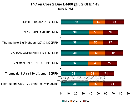 Посмотрим на результаты, продемонстрированные кулерами на минимальных оборотах.
