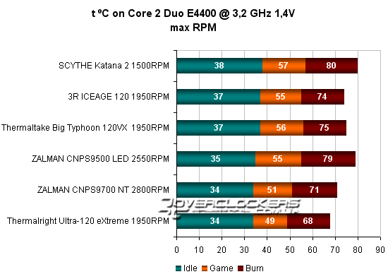 При работе на максимальных оборотах ситуация почти не меняется. Стоит отметить уверенное превосходство кулера Thermalright. Второе место занимает ZALMAN CNPS9700. А вот его младший брат, ZALMAN CNPS9500, снова занимает второе место от конца. 3R ICEAGE 120 держится молодцом и демонстрирует результат лучше чем более дорогие кулеры - Big Typhoon и все тот же неудачный ZALMAN CNPS9500. Замыкает список SСYTHE Katana 2, что учитывая его размеры и цену вполне закономерно.