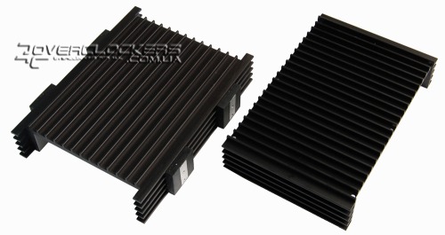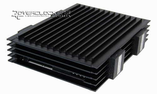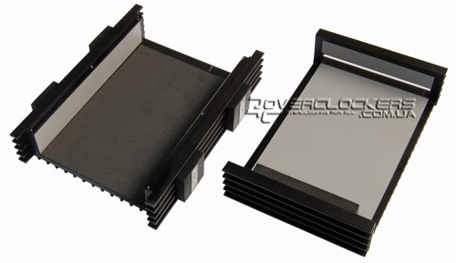 На верхнюю и нижнюю поверхность наклеиваются упругие теплопроводящие прокладки и весь этот "бутерброд" укладывается в черный корпус (на фото винчестер вверх дном).