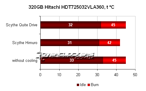Рассмотренные СО собственно для пасивного охлаждения HDD годятся слабо. Если же изначально подобрать тихий и прохладный накопитель, то Scythe Himuro вполне подойдет для того, чтобы снизить температуру на несколько градусов и значительно уменьшить уровень шума. К примеру, данной системы охлаждения вполне достаточно для того чтобы сделать бесшумным 320GB WD3200AAKS. А вот для тестируемого Hitachi HDT725032VLA360 его уже недостаточно.