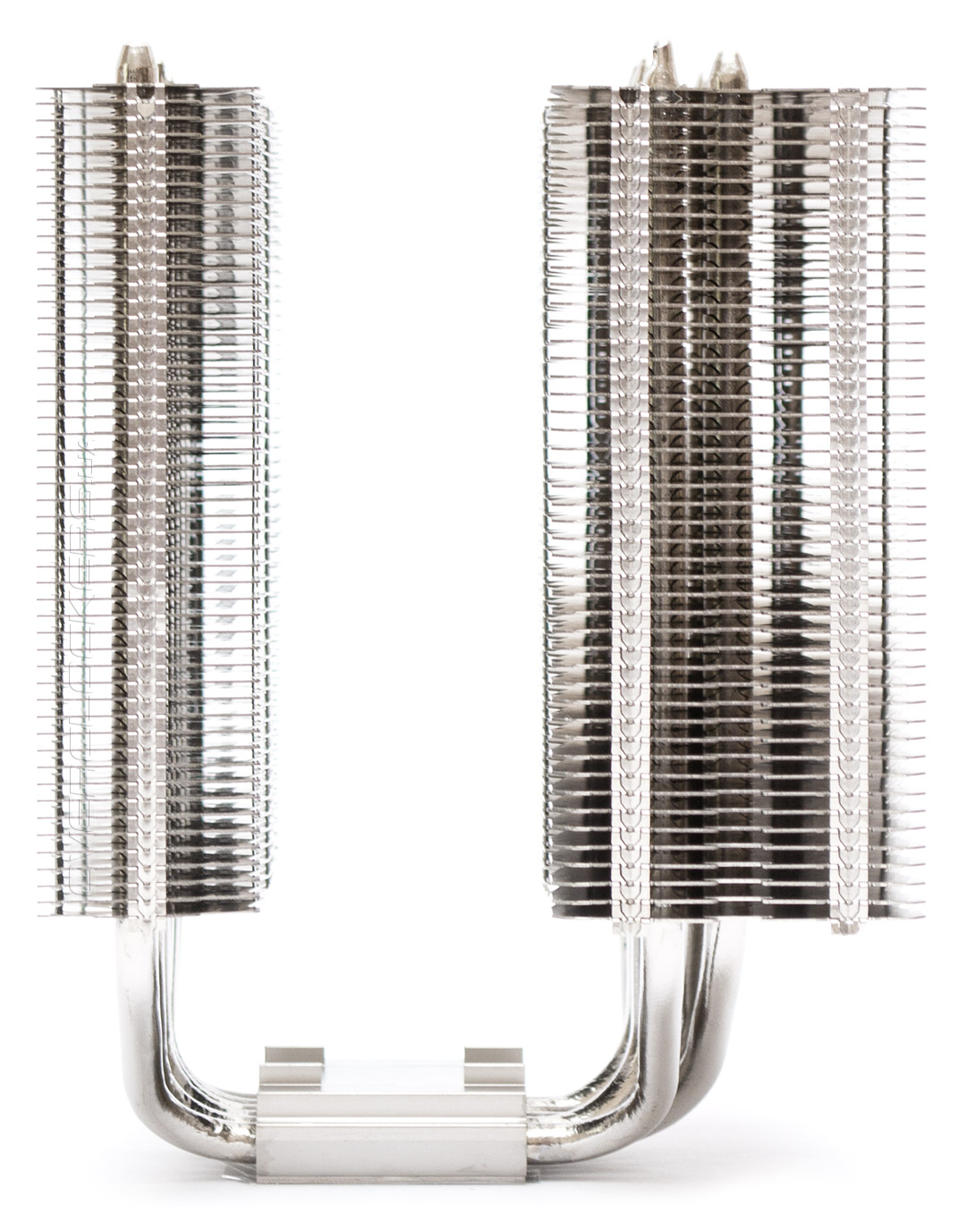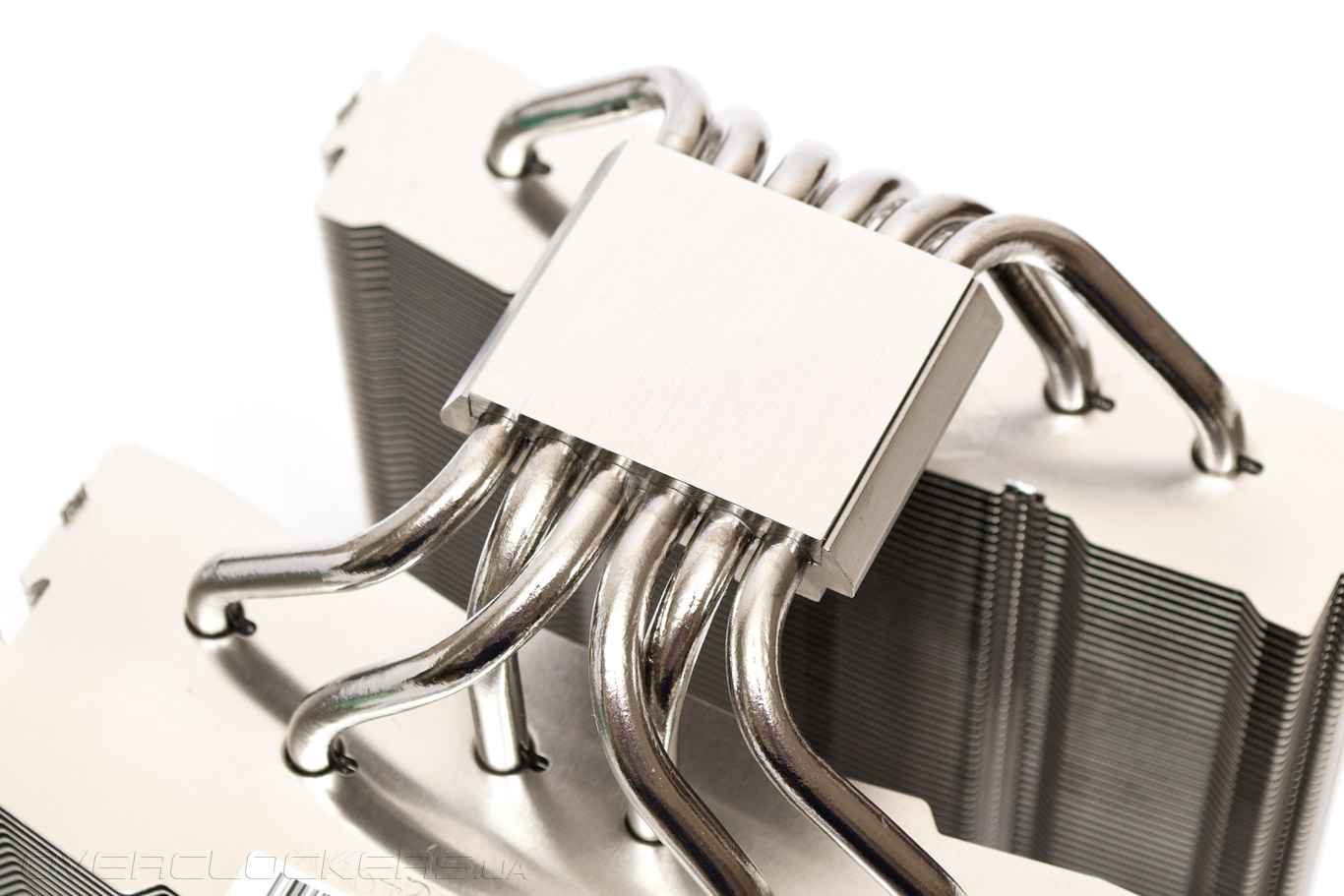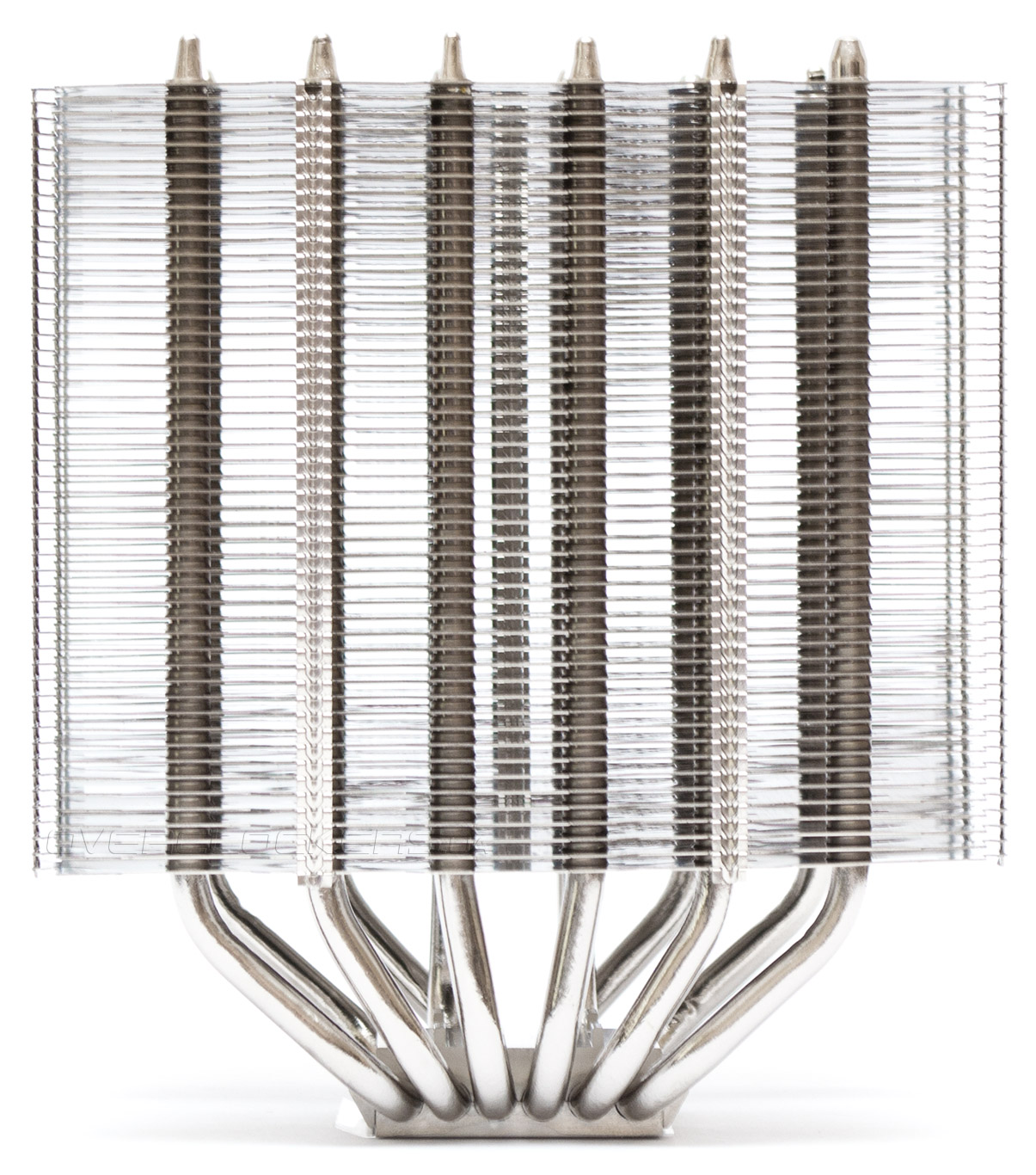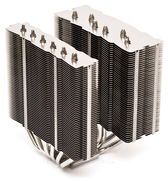 Секции разной толщины. Это сделано с целью повышения совместимости кулера с оперативной памятью. Условно «передняя», более мелкая часть, в глубину занимает 30 мм и состоит из 51 ребра, расположенного с зазором 1,8 мм. Задняя, более крупная секция, имеет глубину 50 мм и насчитывает 47 пластин, расставленных с промежутком 2 мм. Нетрудно подсчитать, что суммарная площадь рассеивания данного радиатора превышает 11 000 см², что всего на тысячу меньше чем у другого заслуженного суперкулера — Noctua NH-D14.