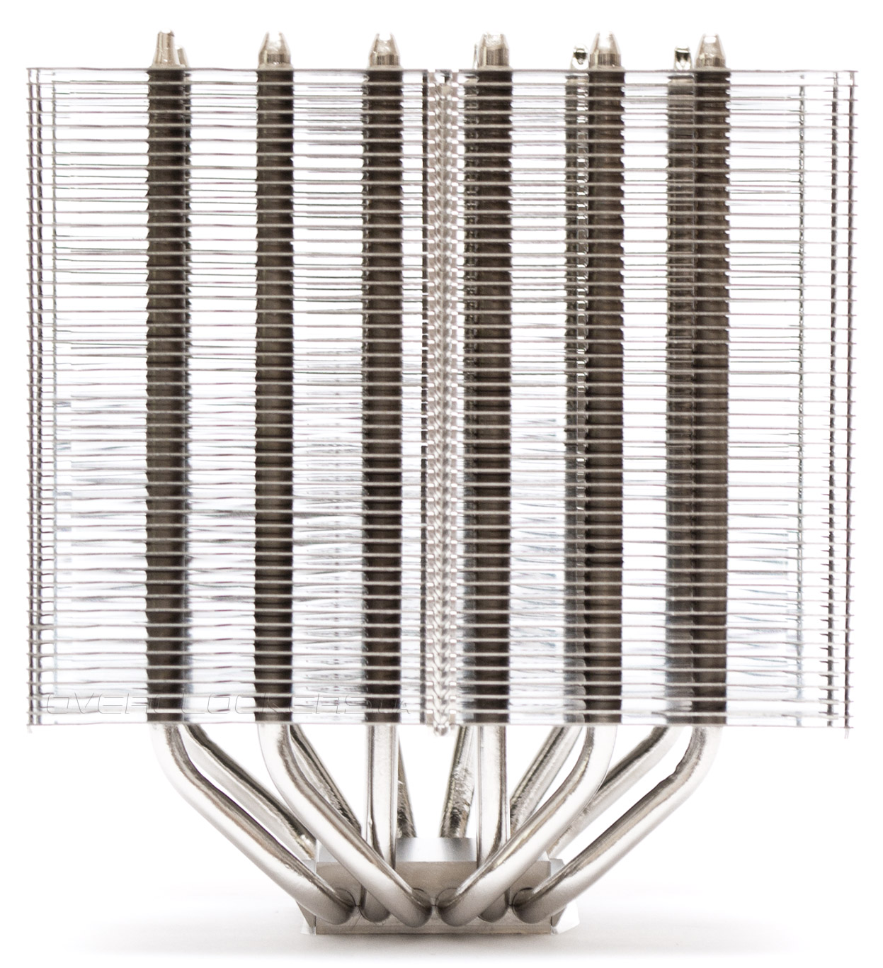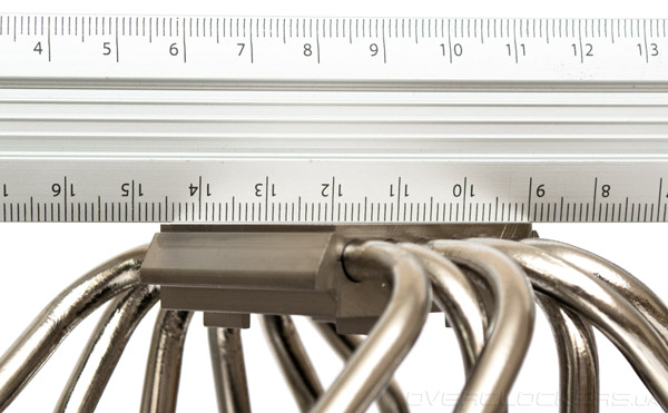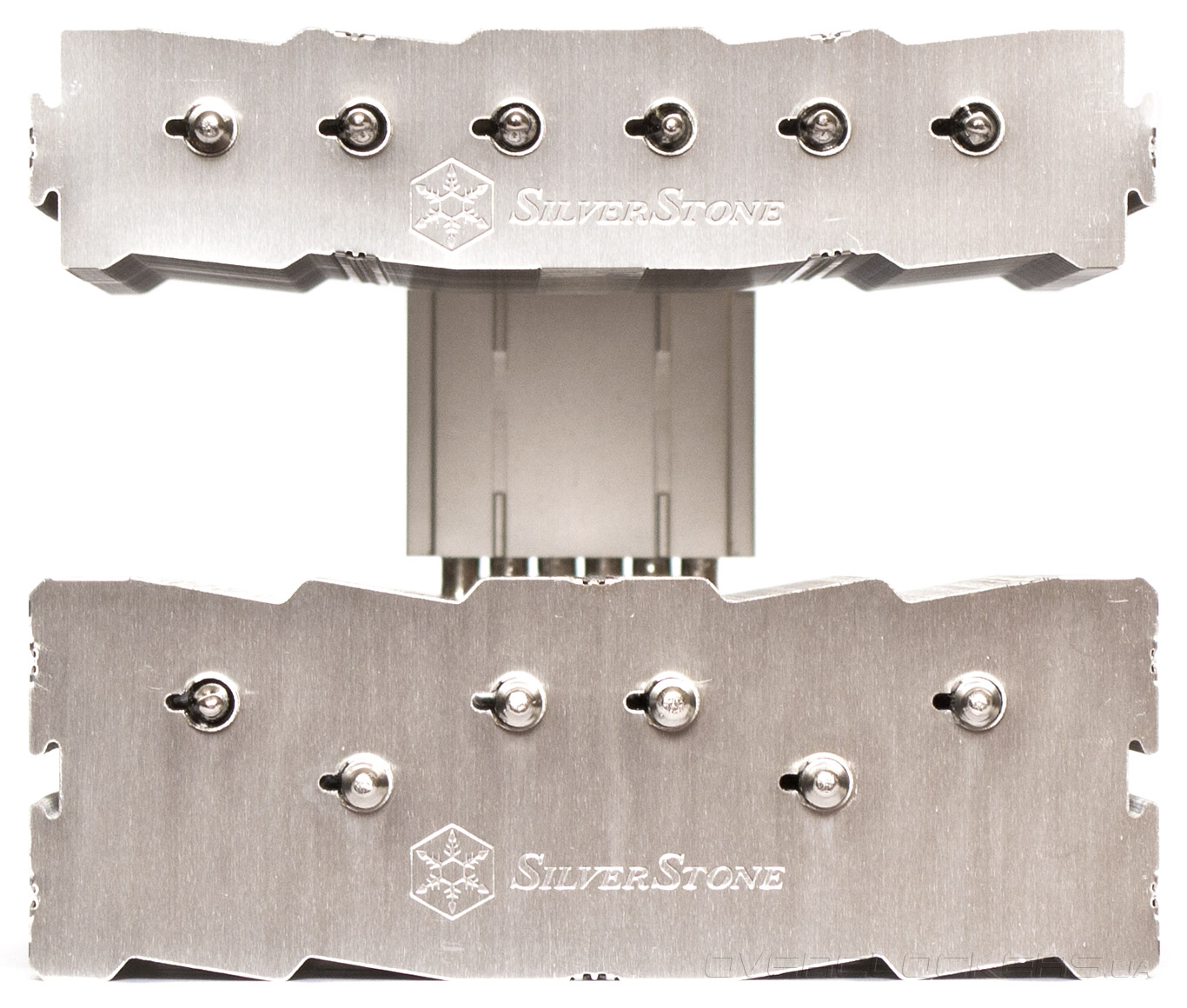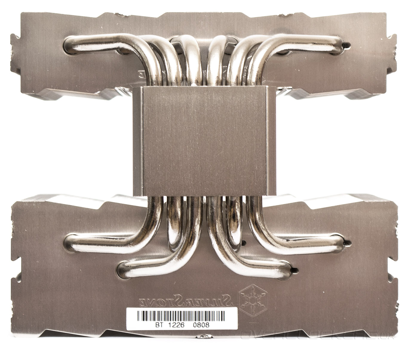 Основу конструкции SilverStone Heligon HE-01 составляют шесть тепловых трубок диаметром 6 мм. Они проходят через две крупные секции радиаторных пластин. Общая высота кулера — 160 мм, ребра радиатора имеют длину 140 мм. На следующей картинке мы наблюдаем переднюю часть кулера. Трубки разведены равномерно, на 14 мм друг от друга.