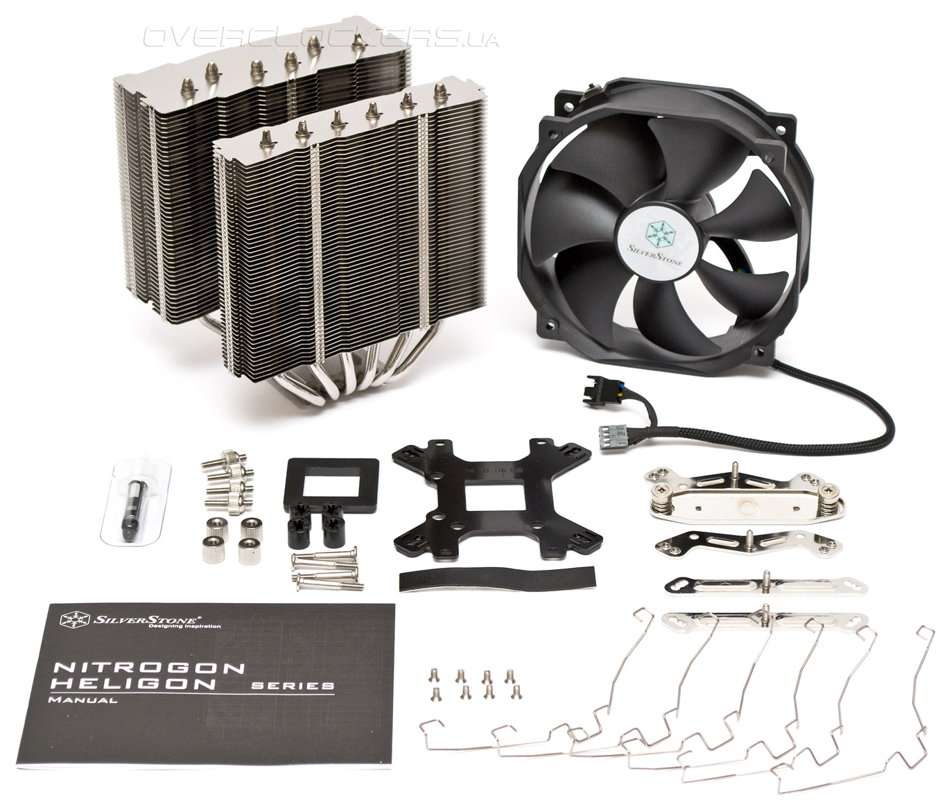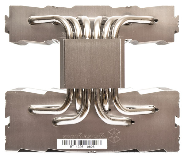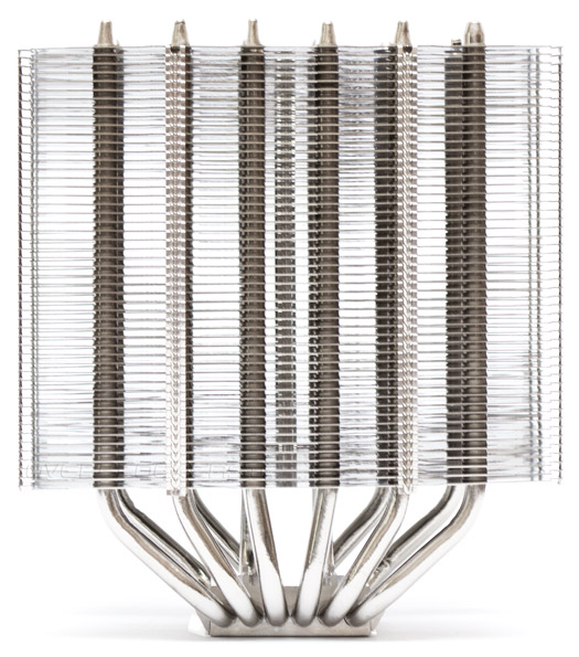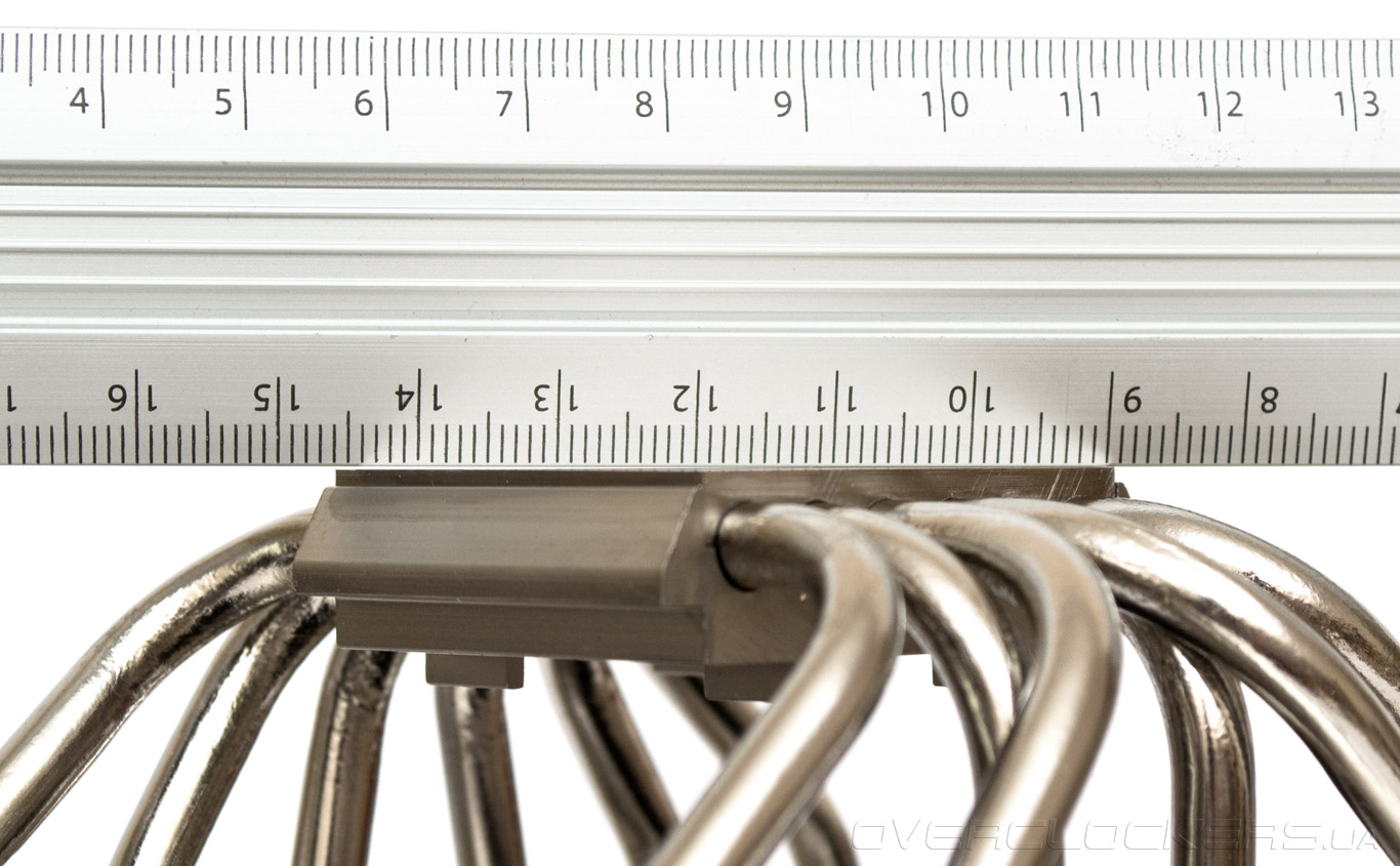 Основу конструкции SilverStone Heligon HE-01 составляют шесть тепловых трубок диаметром 6 мм. Они проходят через две крупные секции радиаторных пластин. Общая высота кулера — 160 мм, ребра радиатора имеют длину 140 мм. На следующей картинке мы наблюдаем переднюю часть кулера. Трубки разведены равномерно, на 14 мм друг от друга.