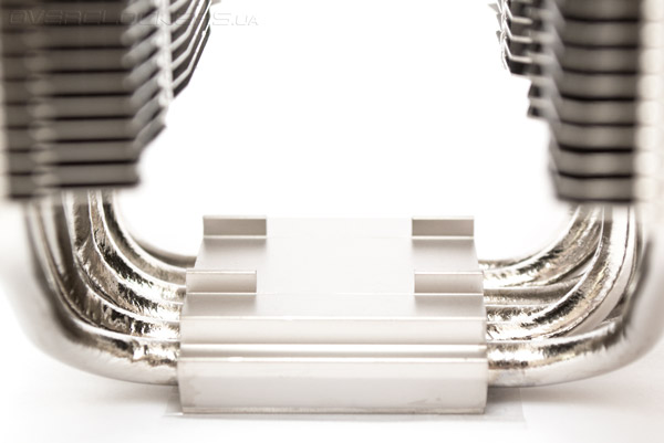 Тепловые трубки качественно припаяны к основанию, но на ребрах радиатора следов пайки нет. Вероятно, они просто механически посажены на свои места.