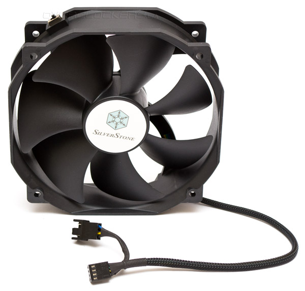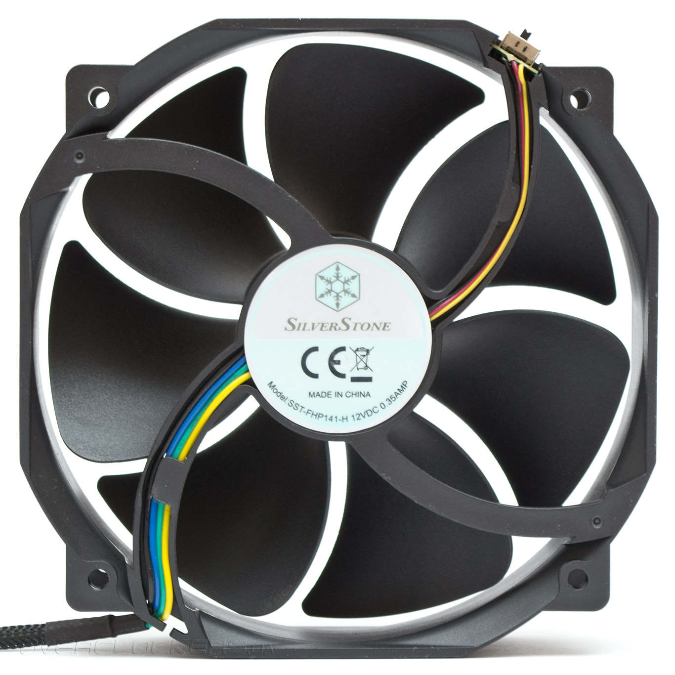 Основным и неоспоримым преимуществом SilverStone Heligon HE-01 перед конкурентами можно считать его стоковый вентилятор. Данная модель носит название SST-FHP141-H и продается как в комплекте с кулером, так и отдельно в рознице. Фактический размер составляет 140х38 мм, но посадочные места соответствуют типоразмеру 120 мм. Подключение четырехконтактное с разъемом для еще одной вертушки, поддерживающей ШИМ-модуляцию управления скоростью вращения. Длина шнура питания составляет 250 мм, дополнительного — 50 мм.