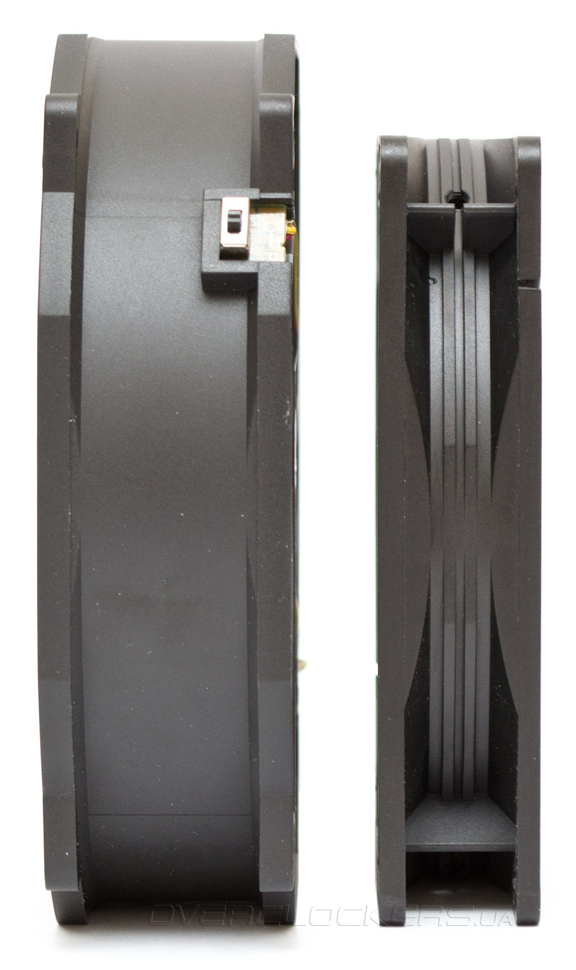 Вентилятор можно считать бесшумным до 600 об/мин, достаточно тихим до 1000 об/мин и терпимым до 1300 об/мин. На более высоких скоростях проявляется аэродинамический шум лопастей, напоминающий рев самолета на взлете. Воздушный поток и создаваемое давление при любой скорости можно охарактеризовать словом «великолепно». Для сравнения мы сфотографировали SST-FHP141-H (слева) в профиль, рядом с обычной 120-мм моделью (справа).