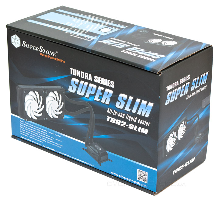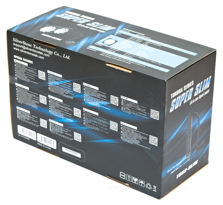 Упаковка SilverStone Tundra TD02-Slim выглядит привлекательно. В оформлении преобладает черно-синяя гамма оттенков. Здесь есть графические изображения продукта и его основных достоинств, таблица с техническими характеристиками и перечисление главных преимуществ кулера на 11 языках.