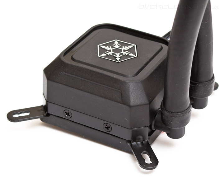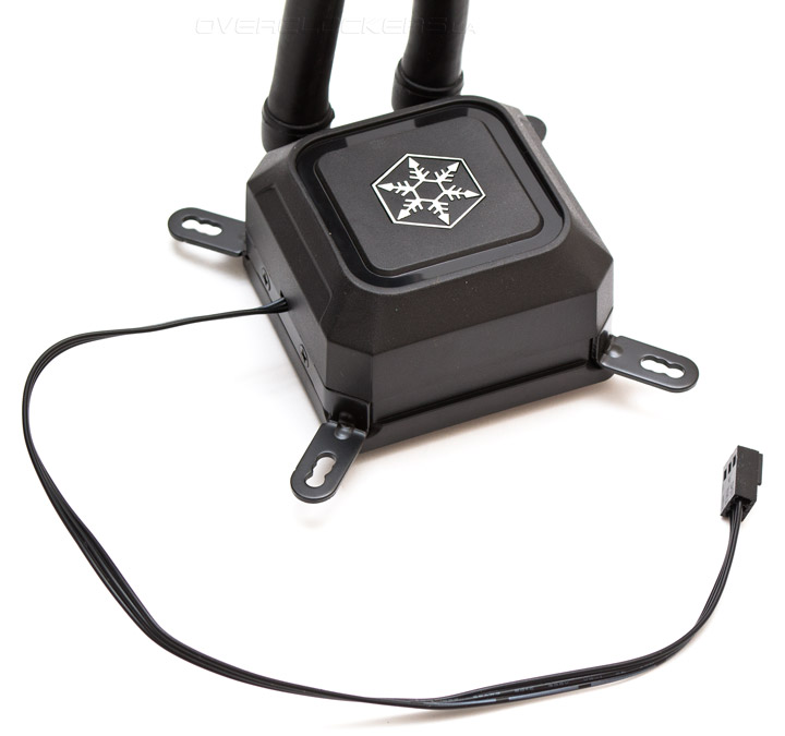 Водоблок в сборе с помпой состоит из пластмассового корпуса и металлического основания. Габариты — 65х65х40 мм. Логотип SilverStone в виде снежинки на верхней крышке водоблока имеет блеклую синюю подсветку по контуру. Шнур питания помпы трехконтактный, длиной 270 мм. Скорость вращения лопастей помпы по нашим замерам может достигать 2800 об/мин при 12 В, а стартовать она способна с 900 об/мин и 3 В. К сожалению, это единственный бесшумный режим ее работы. На всех остальных скоростях мотор издает противное и навязчивое жужжание. И это даже несмотря на то, что общий уровень его шума не превышает 42 дБ (А).