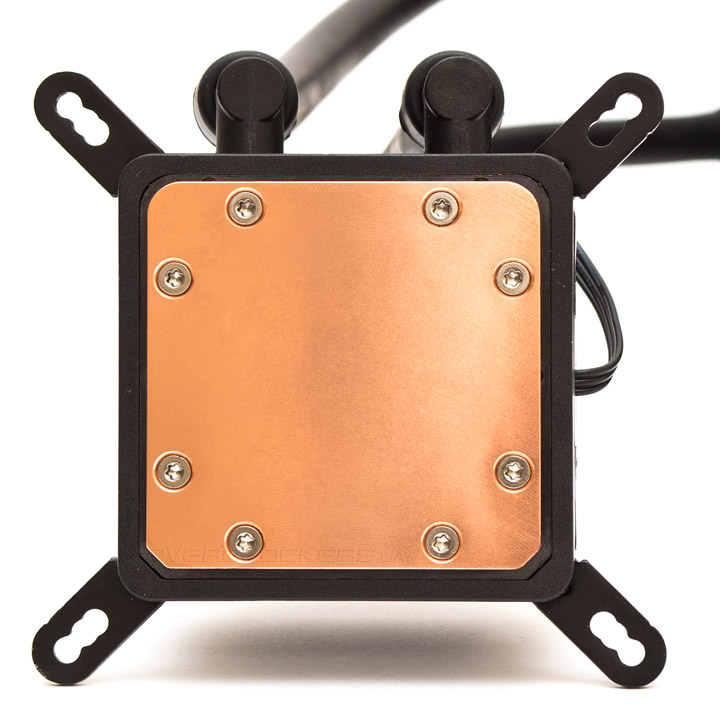 Основание водоблока медное, достаточно ровное и несущее на себе радиальные следы фрезеровки. К корпусу оно прикручено восемью винтами типа Torx, которые являются лишней мерой предосторожности против слишком любопытных пользователей. С его обратной стороны должны находиться 0,2-мм микроканалы, улучшающие теплообмен.
