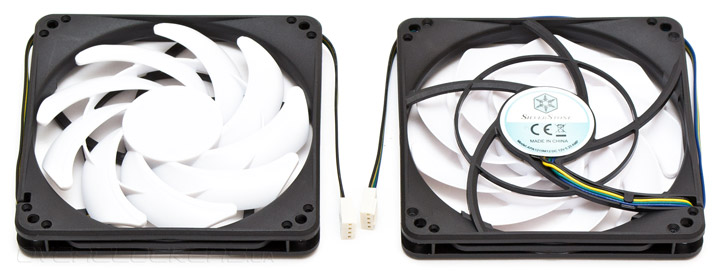 Два 120-мм вентилятора, используемые в данной системе, имеют нестандартную толщину в 15 мм. Белая крыльчатка состоит из девяти сильно загнутых лопастей, соединенных посередине для жесткости дополнительным кольцом. В качестве подшипника здесь используется втулка скольжения, однако, она очень тихая. Скорость вращения регулируется с помощью ШИМ в диапазоне от 800 до 2300 об/мин. Шум составляет от 35 до 54 дБ (А) соответственно. Относительно тихий режим работы для двух вентиляторов в паре — это 1200 об/мин. Длина четырехконтактного шнура питания — 310 мм. Маркировку и краткие электрические характеристики можно рассмотреть на фотографии.