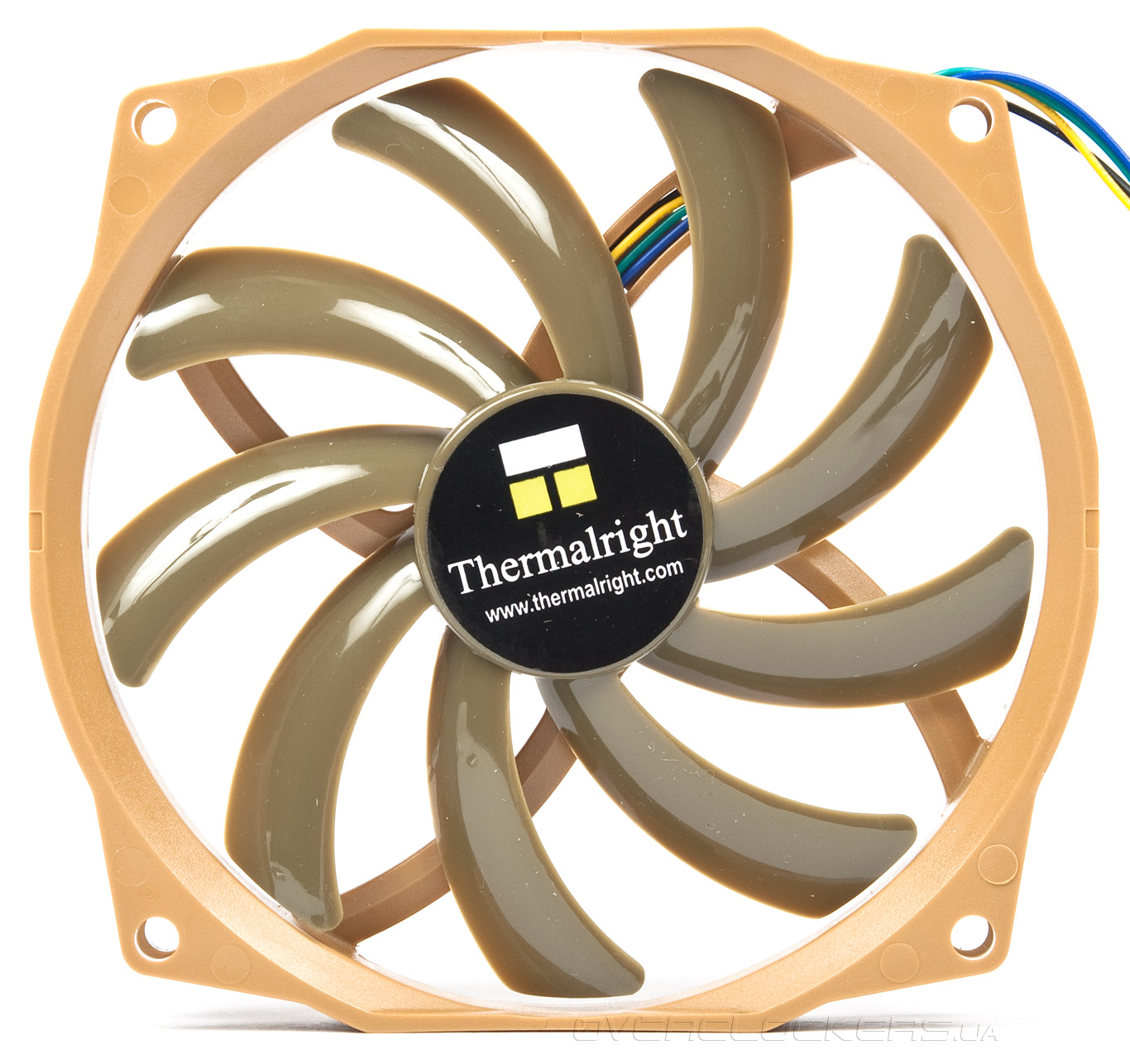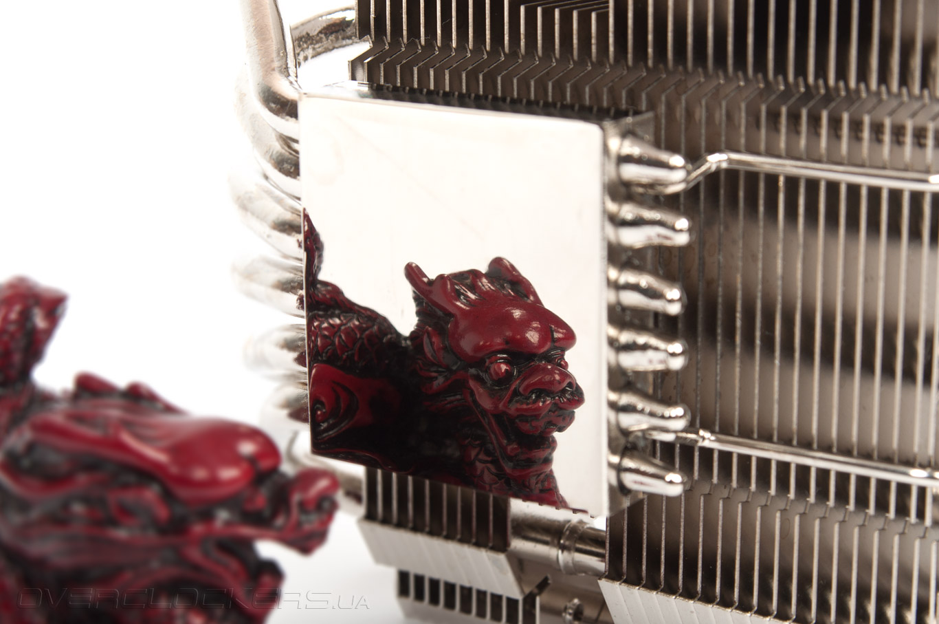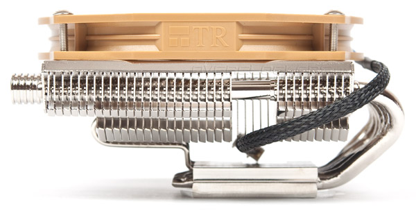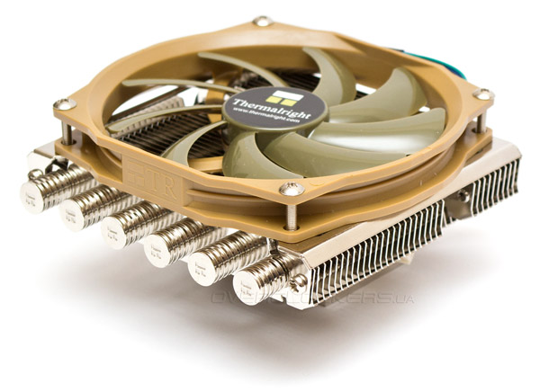 Концы тепловых трубок закрыты декоративными колпачками, содержащими миниатюрный логотип Thermalright. В этом ракурсе радиатор имеет ширину 106 мм.