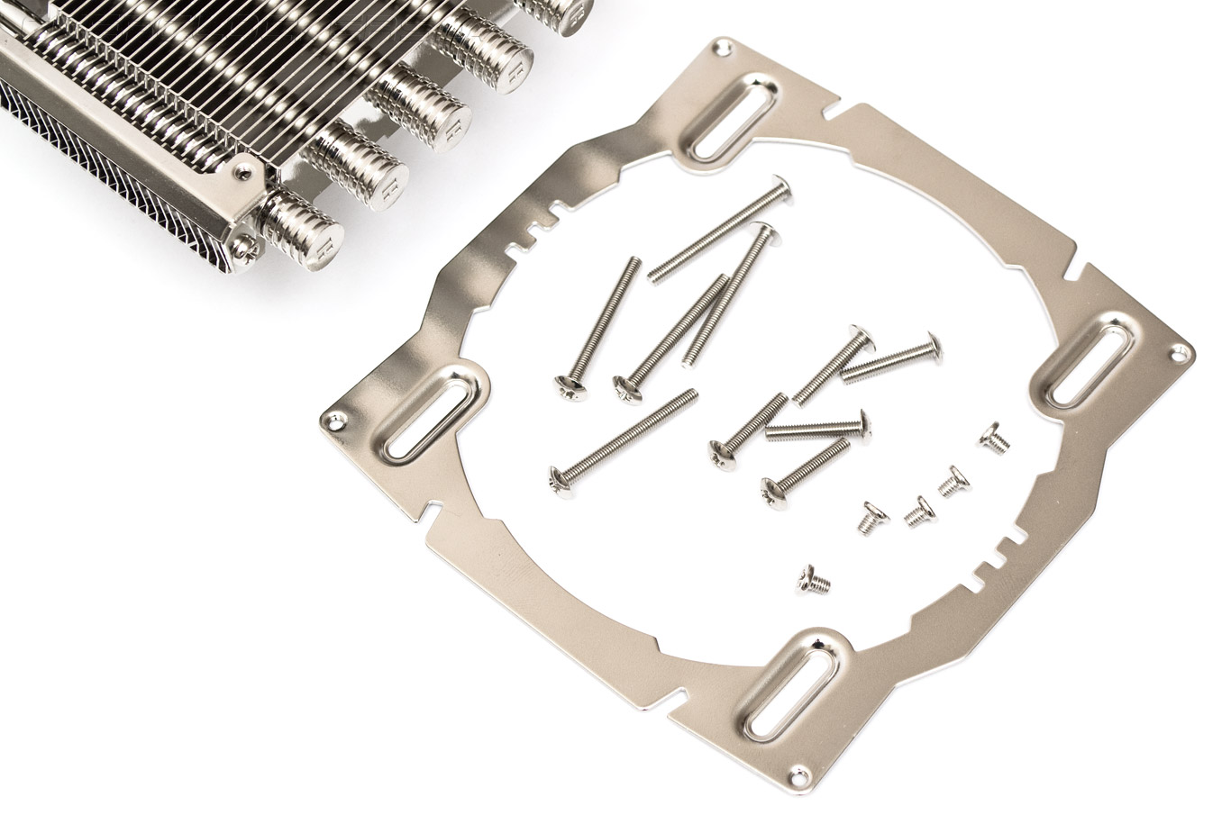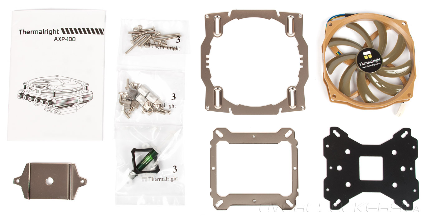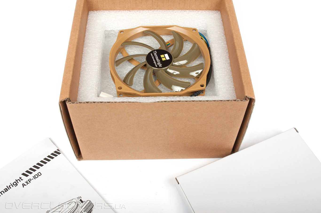 В комплекте с Thermalright AXP-100 поставляется рамка-переходник, позволяющая прикрепить вентилятор типоразмера 120 мм к отверстиям, рассчитанным на 92-мм вертушку. Длинные винты предназначены для пропеллеров толщиной 25 мм, средние — для 14 мм, а самые маленькие служат для крепления переходника. К каждому типу винтов полагается по одному запасному. Продолговатые отверстия на рамке позволяют смещать ее на +/– 15 мм относительно радиатора, чем уменьшают вероятность несовместимости большого вентилятора с обвязкой материнской платы.
