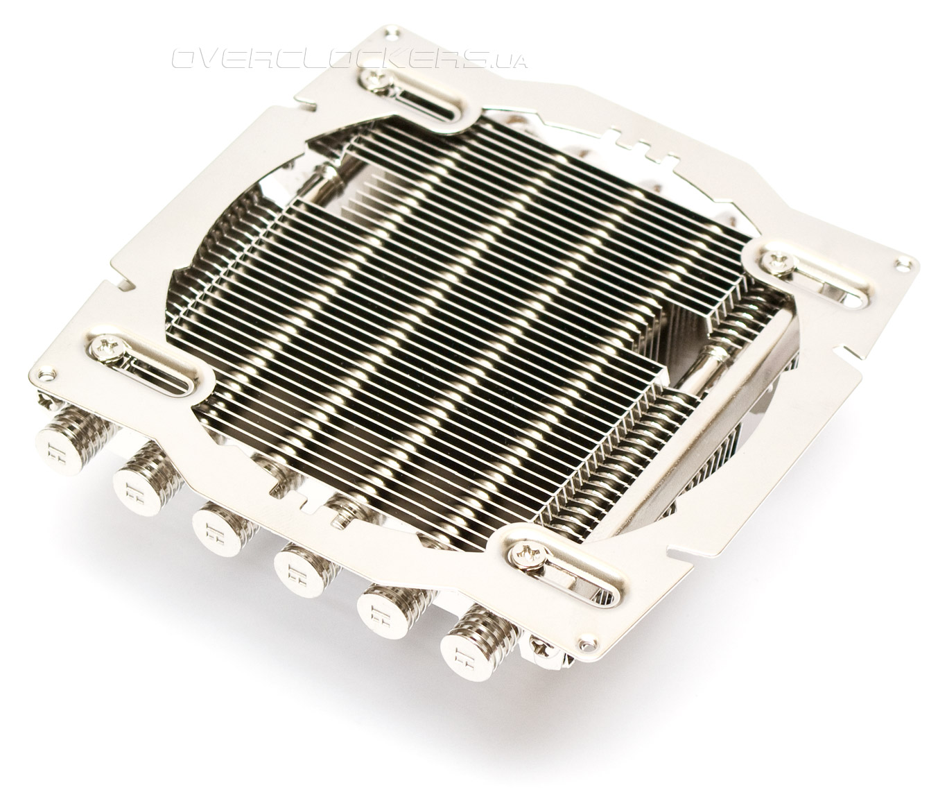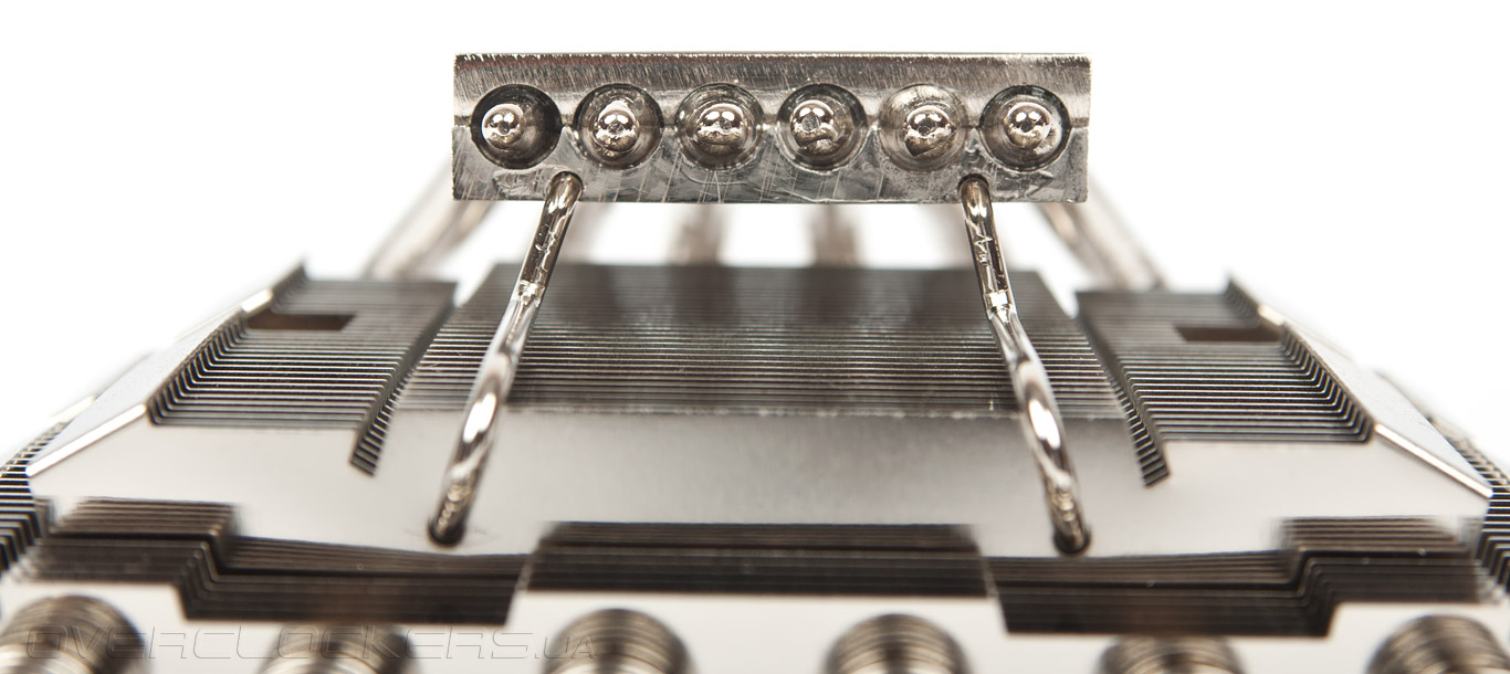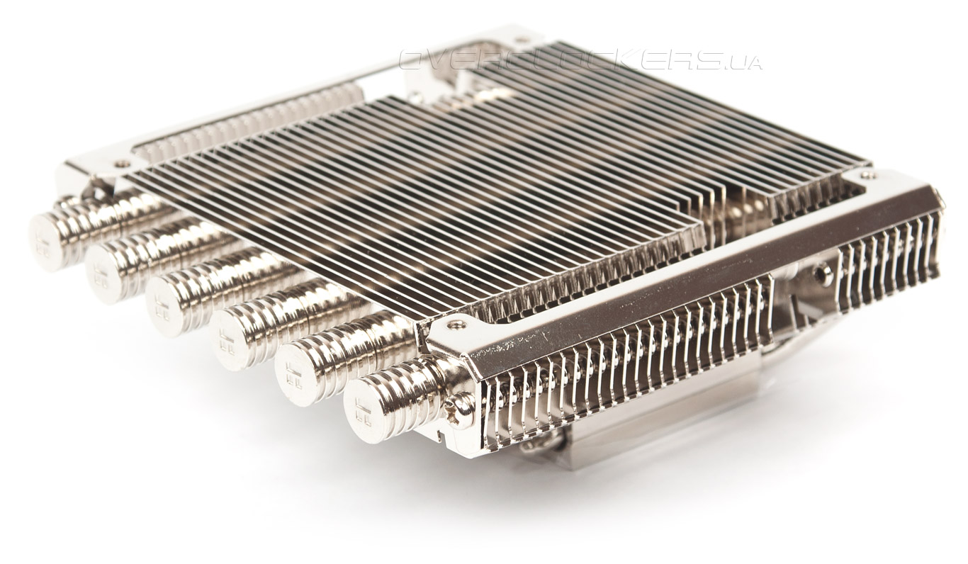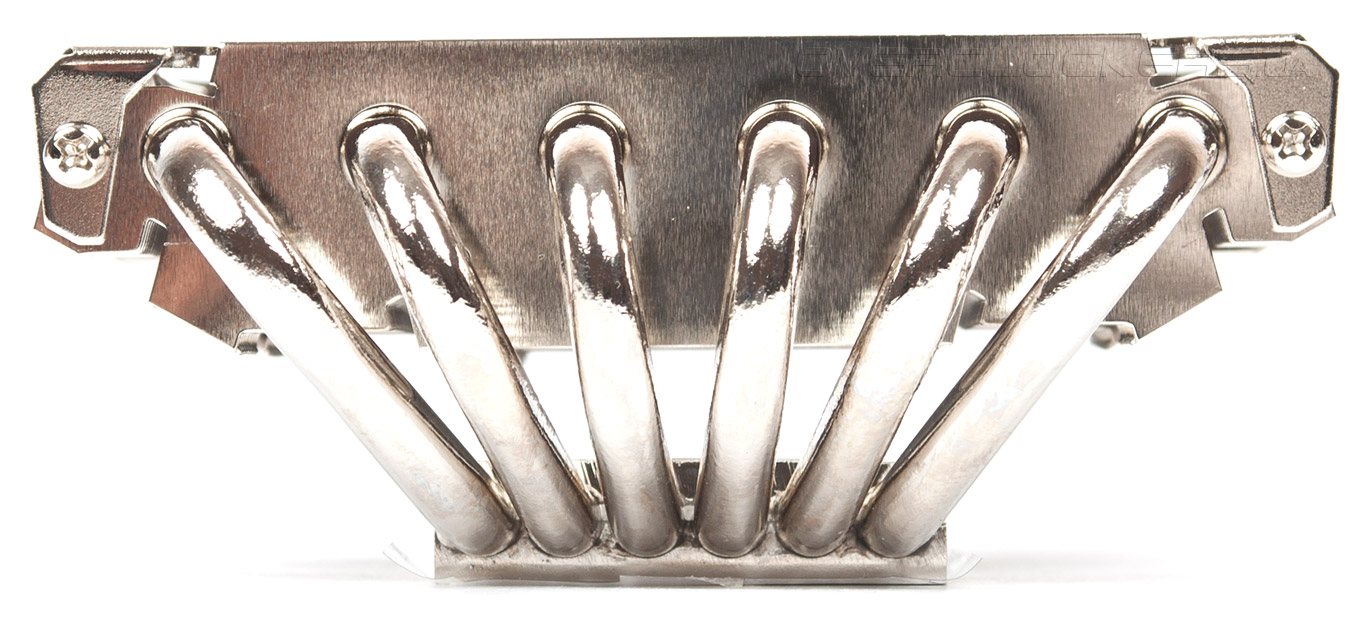 Тепловые трубки плавно загнуты и равномерно разведены по всей плоскости радиатора с шагом в 10 мм. Такая конфигурация обеспечивает наилучшее распределение тепла по поверхности. Высота конструкции в таком виде составляет всего 45 мм.
