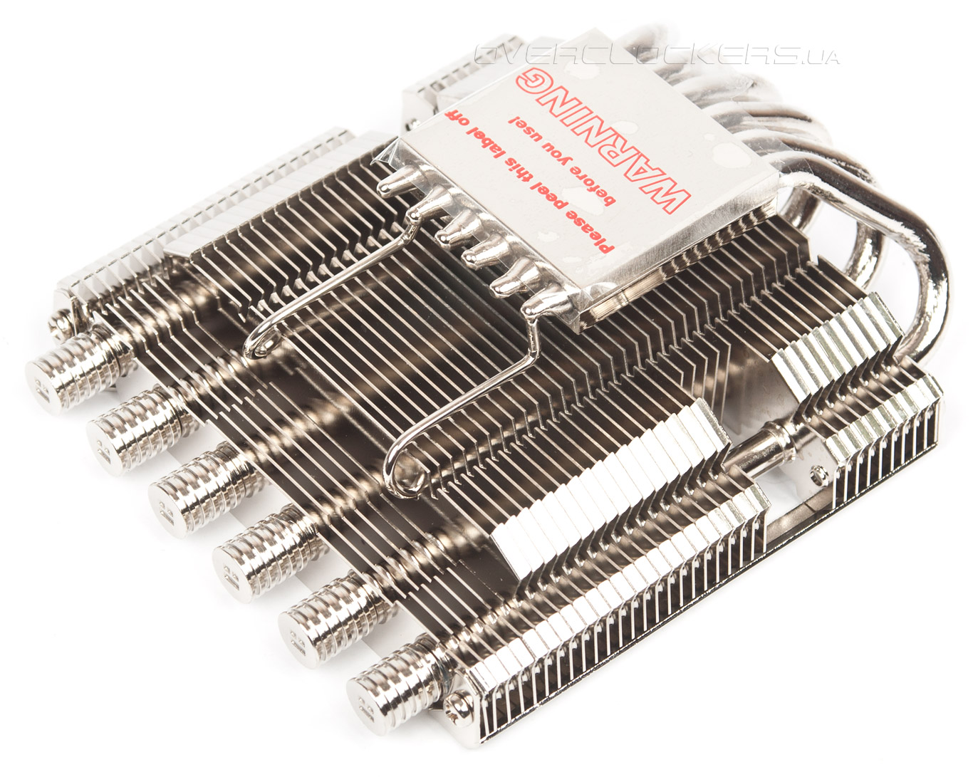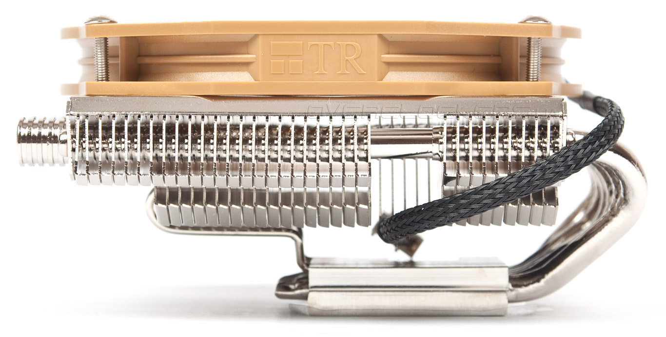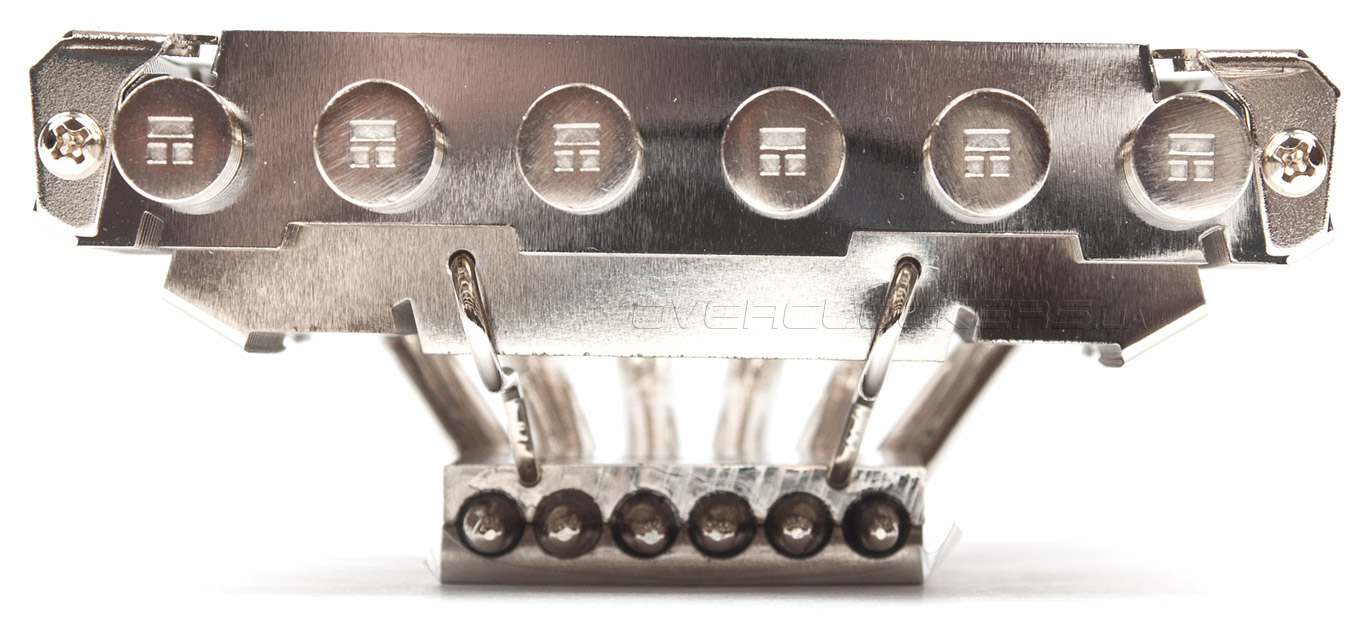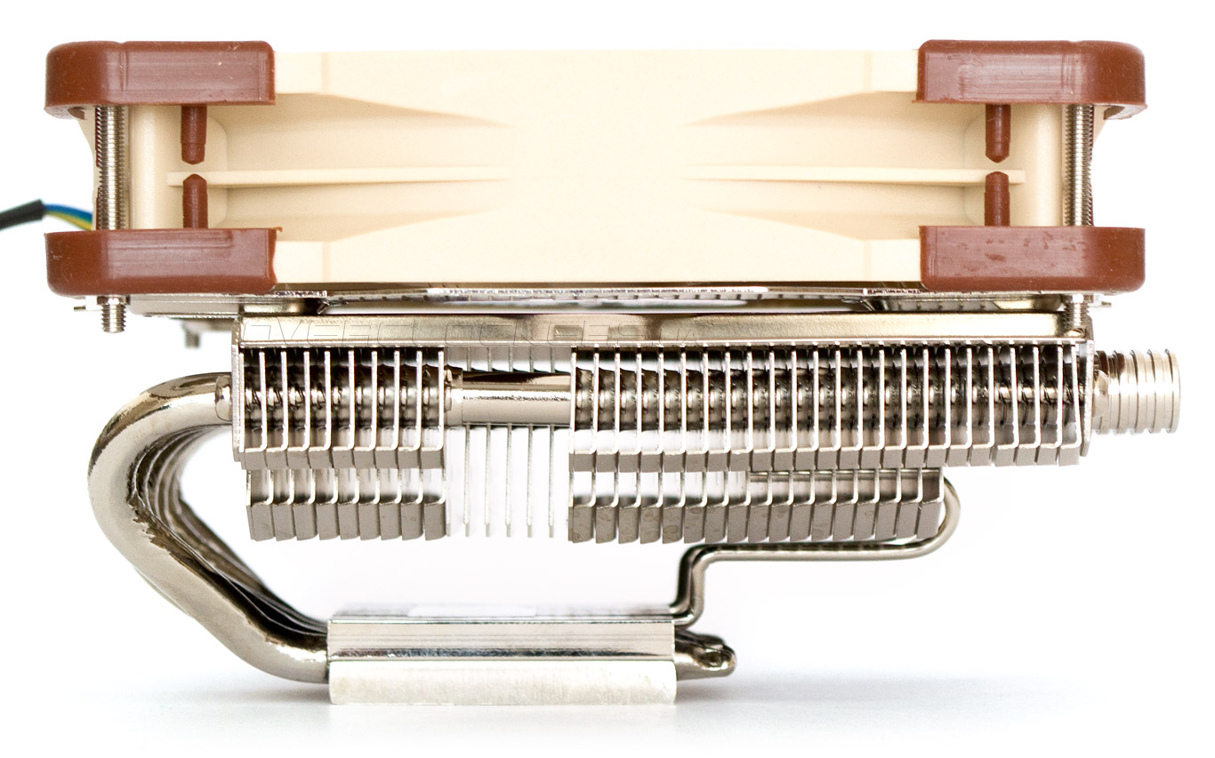 Тепловые трубки плавно загнуты и равномерно разведены по всей плоскости радиатора с шагом в 10 мм. Такая конфигурация обеспечивает наилучшее распределение тепла по поверхности. Высота конструкции в таком виде составляет всего 45 мм.