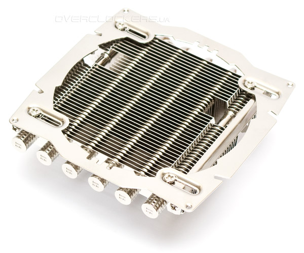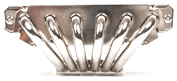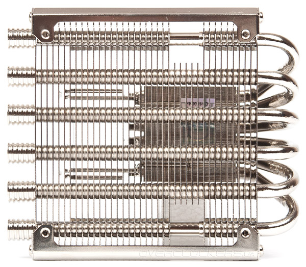 Дистанция между пластинами составляет 2 мм, что довольно много для такого мелкого кулера. Напоминаем, что большее расстояние между ребрами радиатора сильно улучшает его проницаемость для воздушного потока и замедляет накопление пыли. Обратной стороной такого решения является некоторое уменьшение площади рассеивания тепла, ведь поместив пластины ближе, их число можно было бы заметно увеличить. Два квадратных выреза между крайними трубками предназначены для жала отвертки, применяемой при установке. По углам расположены нарезные отверстия для крепления вентилятора.