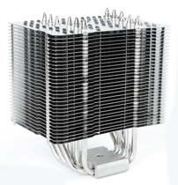 Охладитель Thermalright HR-02 был изначально спроектирован с целью отвода до 130 ватт тепла от центрального процессора без использования вентиляторов. Разумеется, для такого режима работы нужна большая площадь рассеивания тепла. Радиатор представляет собой конструкцию, состоящую из медного основания и шести медных тепловых трубок, пронизывающих 32 перфорированных алюминиевых пластины. Диаметр трубок 6 мм. Толщина рёбер равна 0,5 мм, а межрёберное расстояние составляет 3 мм. Радиатор полностью никелирован.
