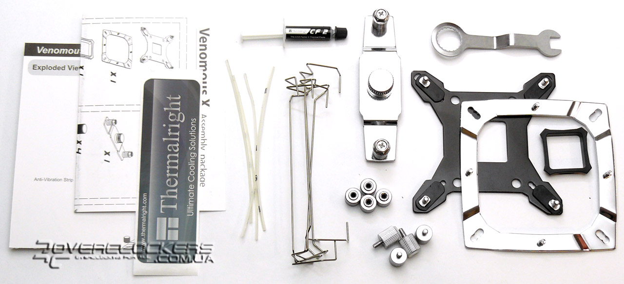 Внутри коробки помимо кулера можно обнаружить инструкцию, универсальный набор крепления для платформ LGA775/1156/1366, виброгасящие полоски под вентилятор, четыре проволочные скобы, ключ и термопасту Chil Factor 2.