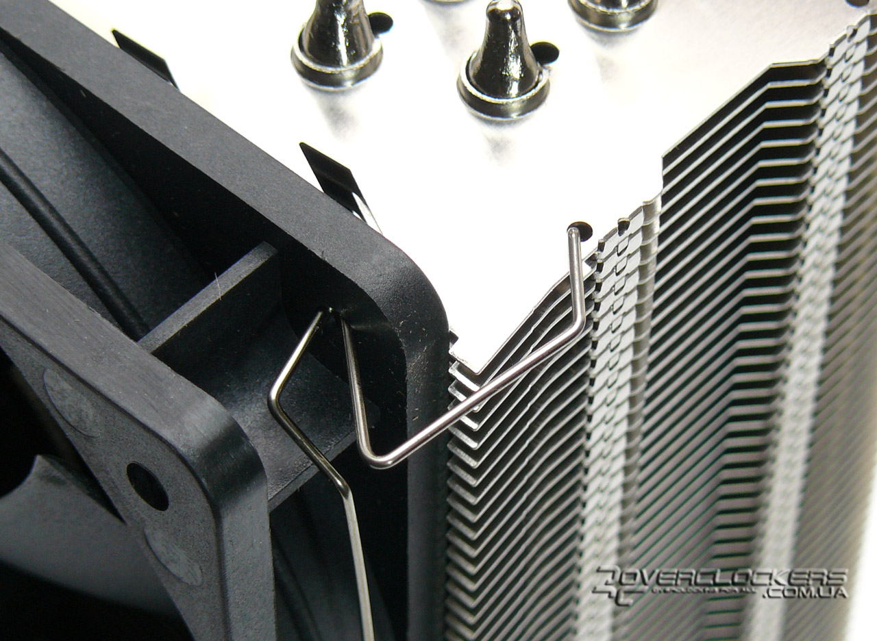 Крепление вентилятора к кулеру осуществляется посредством двух проволочных скоб, концы которых продеваются в соответствующие отверстия на крайних пластинах радиатора. В некоторых предыдущих моделях систем охлаждения Thermalright крепление было не столь удобным и продуманным. Сразу ощущается, что с выпуском Venomous X, компания подошла ответственней к его разработке. Жаль только, что основание, как всегда, оставляет желать лучшего.