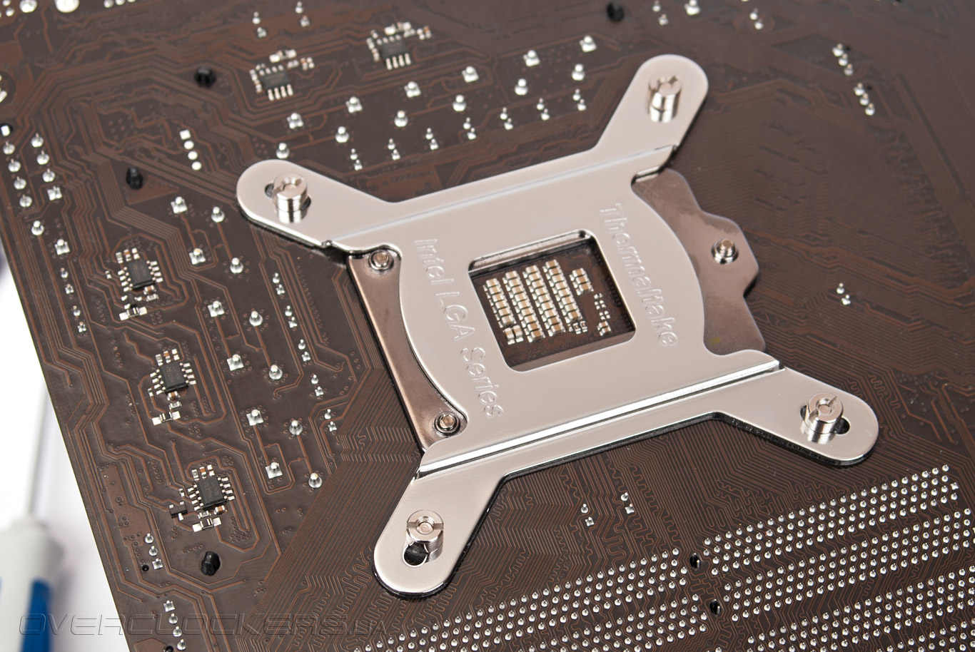 После этого нужно продеть в отверстия на планках монтажные винты, перевернуть радиатор, а сверху на него «надеть» материнскую плату и усилительную пластину. Последним этапом установки является фиксация всей конструкции с помощью гаек особой формы. Удобным этот процесс назвать никак нельзя, а чтобы произвести монтаж Frio в одиночку желательно ещё и как-то зафиксировать материнскую плату, чтобы избежать её случайного повреждения в процессе затягивания крепления.