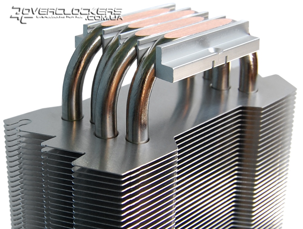Сами трубки расположены не в один сплошной ряд, а с небольшим смещением относительно друг друга. Поэтому и ширина пластин радиатора по краям (в месте контакта с трубками) больше чем по центру для того, чтобы более равномерно распределить тепловую нагрузку. Впрочем, одинаковая ширина увеличила бы общую площадь радиатора, но производитель немного сэкономил, придав такую форму радиатору, тем более что это вписывается и в общий визуальный стиль с зубцами (из-за которых радиатор тоже частично потерял в площади рассеивания).