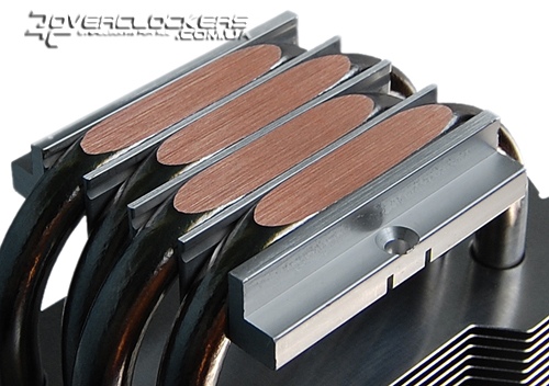 В основании кулера тепловые трубки уложены в желобки тесно друг к другу. Само основание ровное, хотя без какой-либо тщательной полировки.