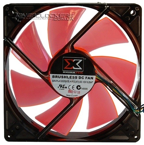 С данной системой охлаждения поставляется вентилятор диаметра 120 мм, являющийся полной копией Xigmatek XLF-F1253, который присутствует в продаже как отдельный продукт. Подключается он четырехштырьковым разъемом, работает в диапазоне от 800 до 1500 об/мин, а создаваемый уровень шума (согласно заявленным данным) не превышает 20,64 дБ. Полупрозрачная крыльчатка имеет красноватый оттенок, который на светлом фоне кажется розовым, а на темном — оранжевым.