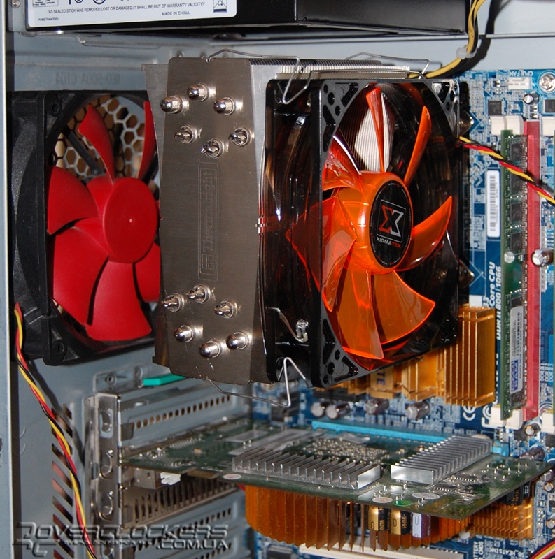 Тестирование кулеров проводилось в закрытом корпусе Chieftec CH-01B. Спереди на боковой стенке в нем расположено два 92-мм вентилятора, подключенных к 5 В, которые почти не нагнетают воздух во внутрь корпуса, а, обдувая жесткие диски, выдувают его через отверстия в противоположной боковой стенке (такова особенность Chieftec CH-01B). Для тестов специально использовалась относительно «холодная» видеокарта GeForce 8600GT, чтобы она оказывала минимальное влияние на повышение температуры внутри корпуса. Использовался блок питания Cooler Master eXtreme Power 500-PCAP, у которого родной вентилятор на 2500 об/мин был заменен на SVEN SV-12025L12S, работающий со скоростью 1200 об/мин.