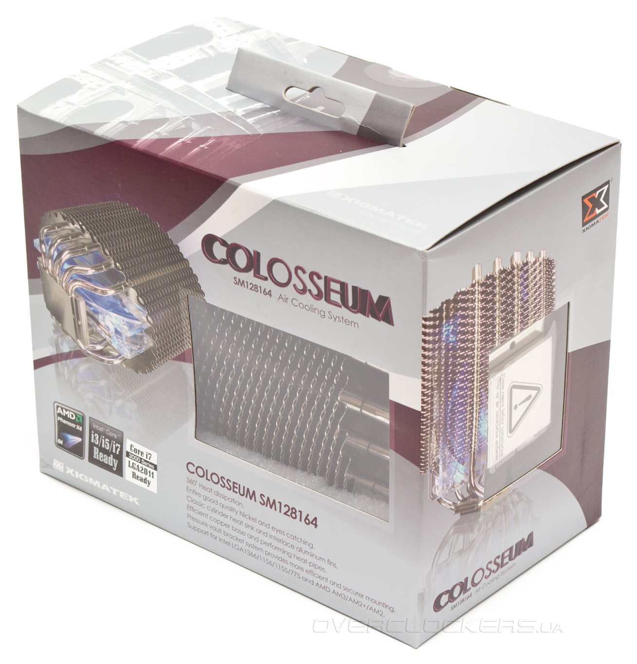 Коробка Xigmatek Colosseum имеет два окошка, позволяющих сразу рассмотреть две особенности продукта — радиаторные пластины непривычной рельефной формы и зеркальную подошву кулера. Здесь же есть значок, упоминающий о совместимости с процессорным разъемом Intel LGA2011, хотя в характеристиках на официальном сайте и на обороте коробки об этом ни слова.