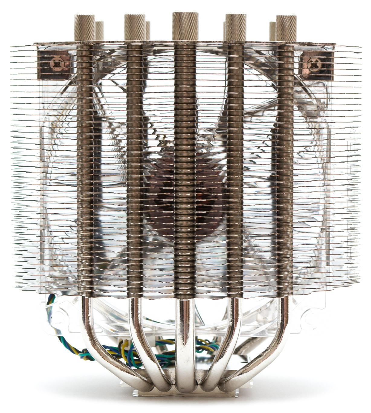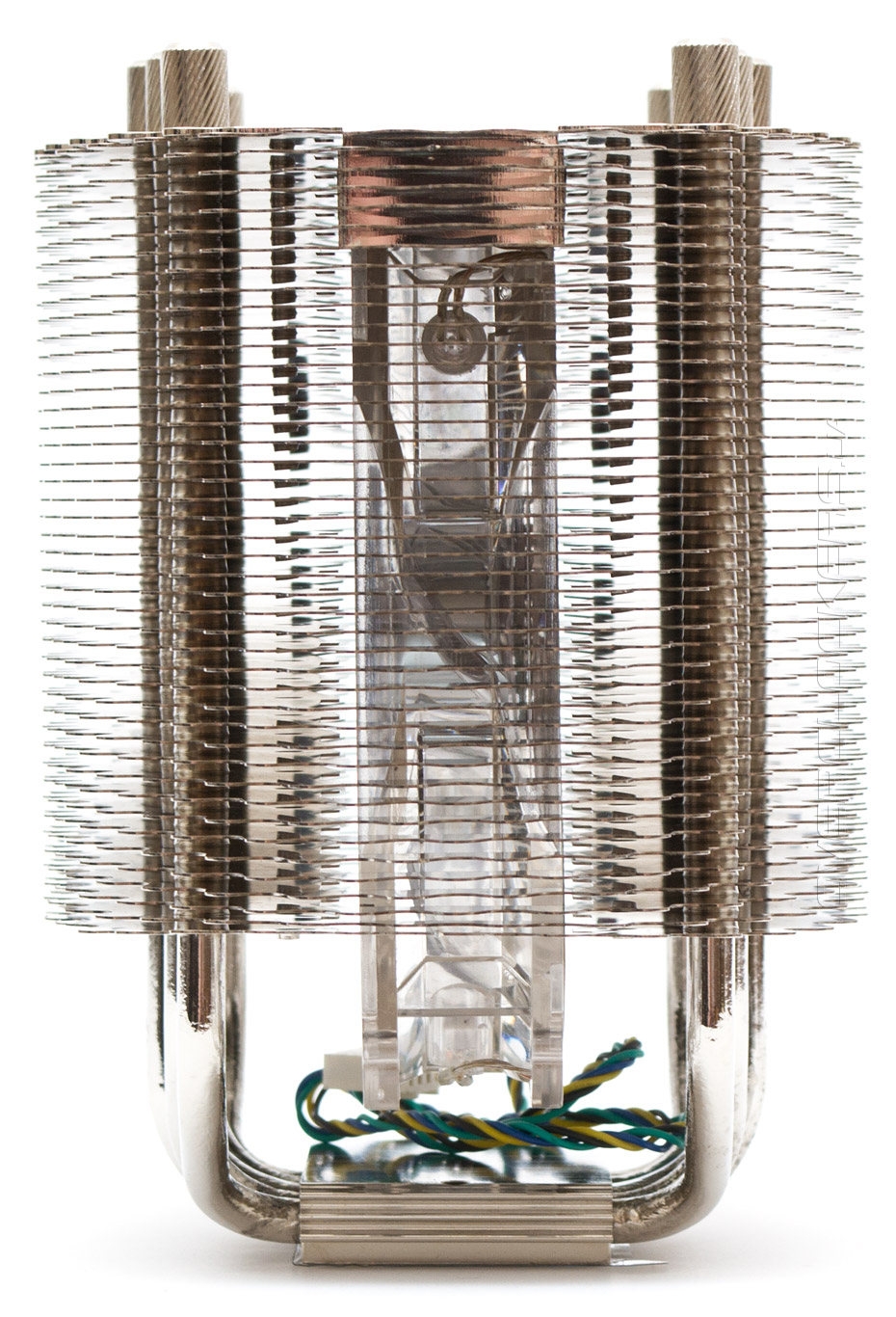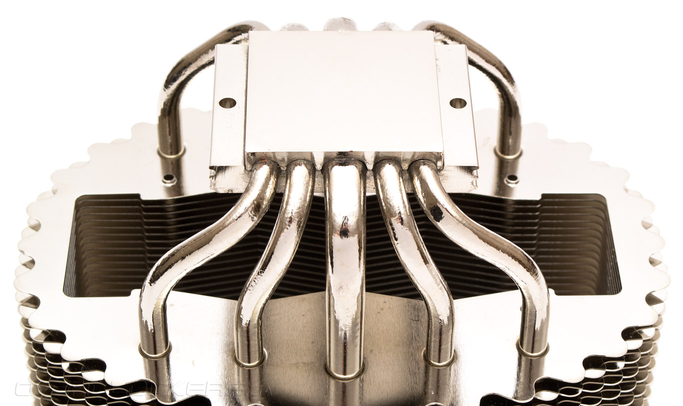 Если повернуть кулер вбок, становится очевидным, что он представляет собой симметричную двухсекционную «башню» с вентилятором по центру, а значит должен обладать неплохими возможностями отвода тепла. Медные тепловые трубки никелированы. В местах соприкосновения с радиаторными пластинами пайка отсутствует. Ширина кулера в данной проекции составляет 109 мм.
