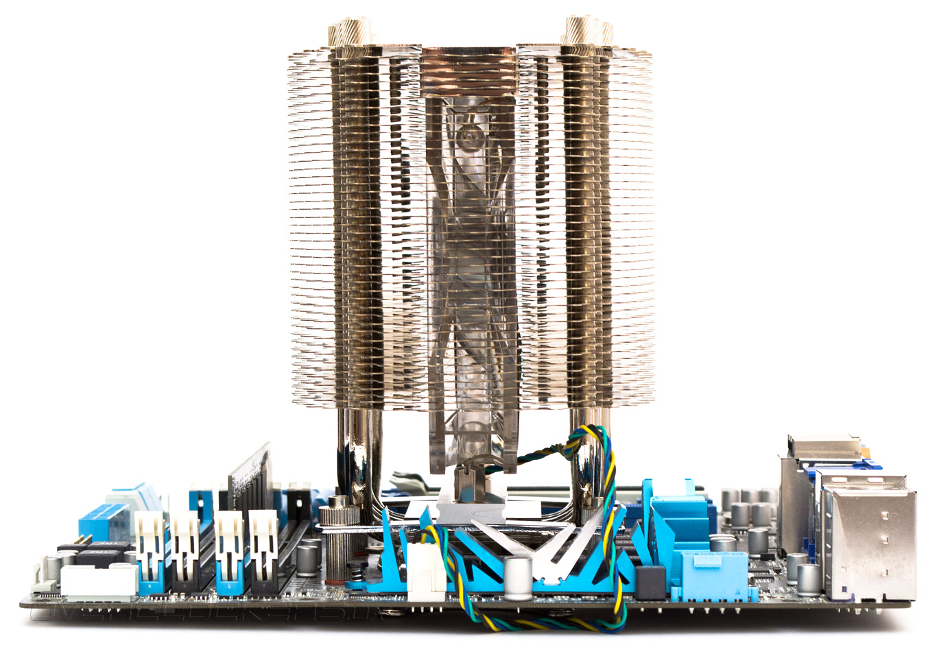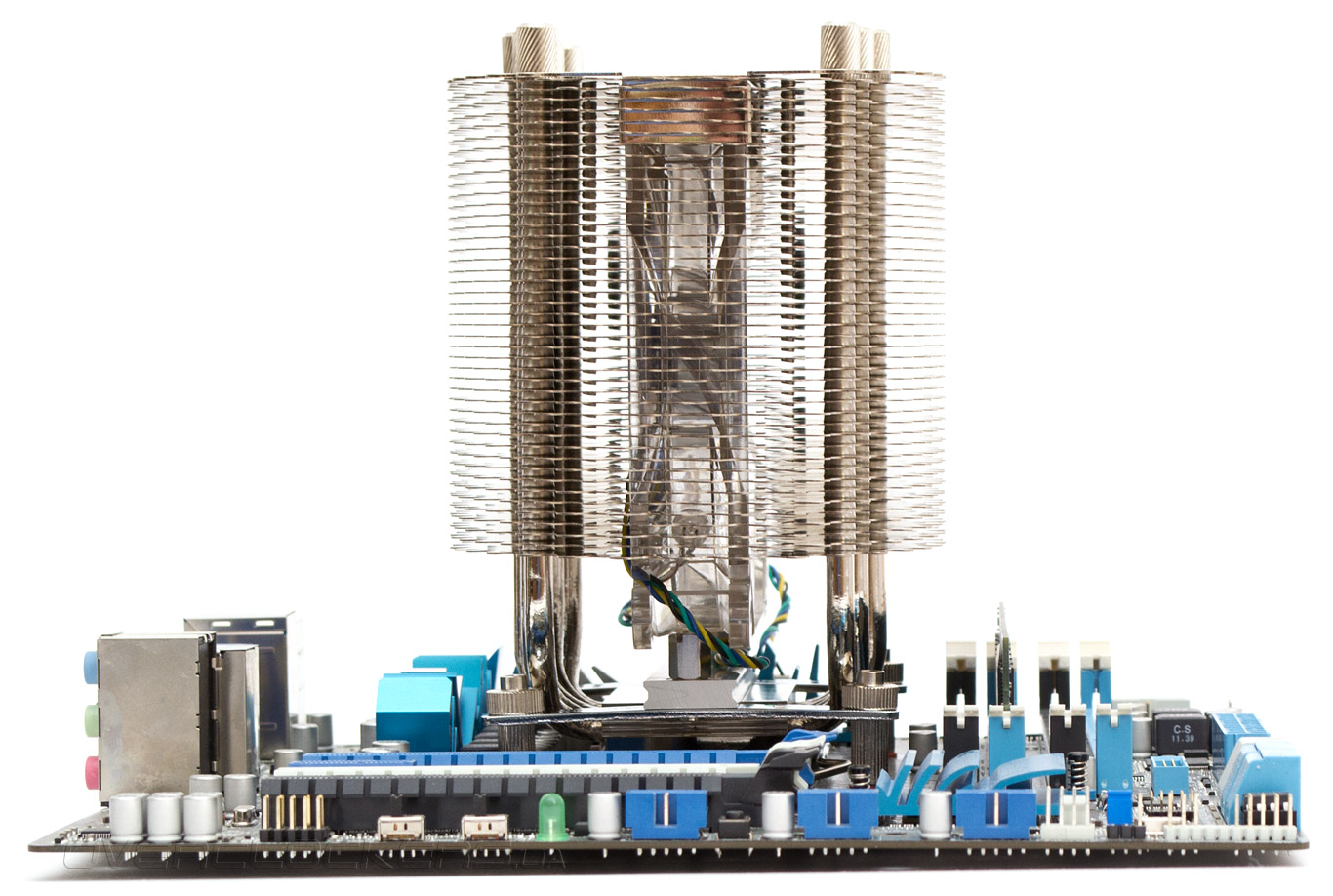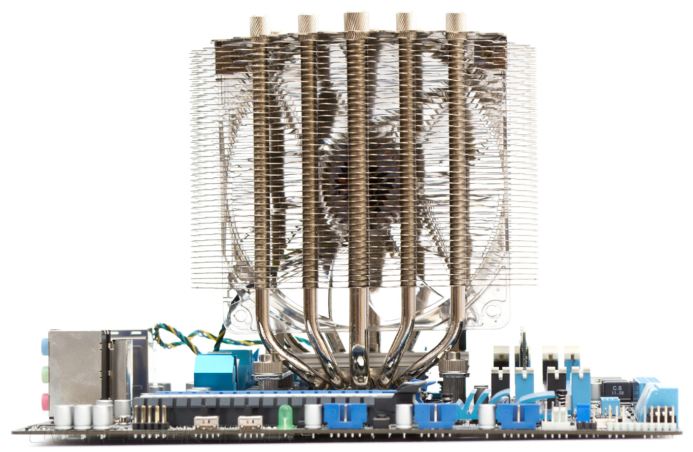 | Материал радиатора и конструкция | Вертикальный радиатор из алюминиевых пластин, нанизанных на 4 медные тепловые трубки диаметром 6 мм и одну 8-мм, расположенные U-образно. Тепловые трубки и основание никелированы | Конструкция из алюминиевых пластин, нанизанных на 5 медных тепловых трубок диаметром 6 мм. Тепловые трубки проходят сквозь медное основание |