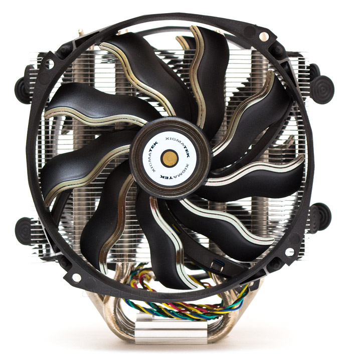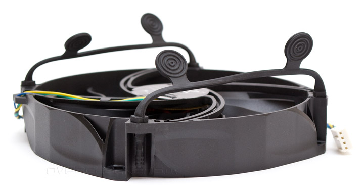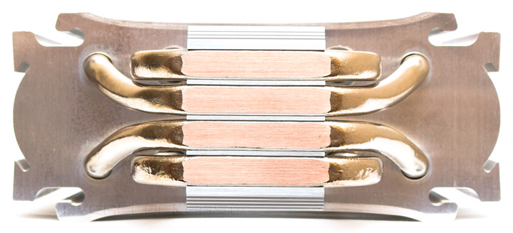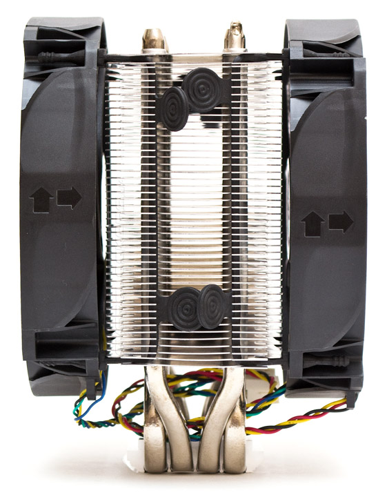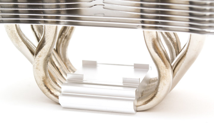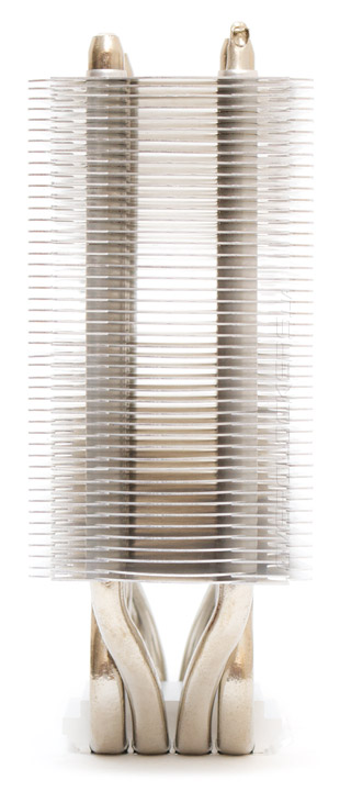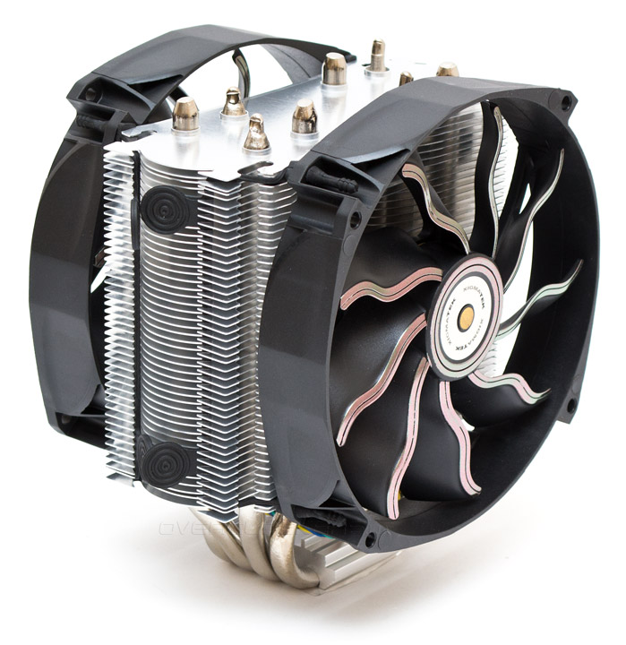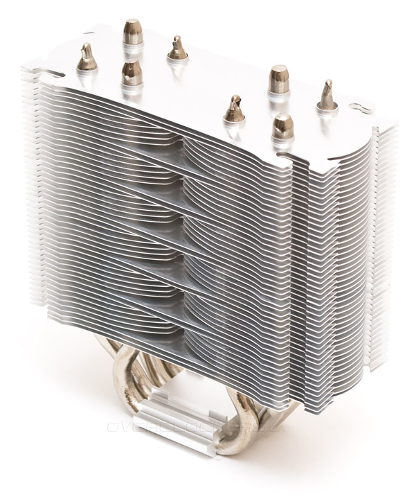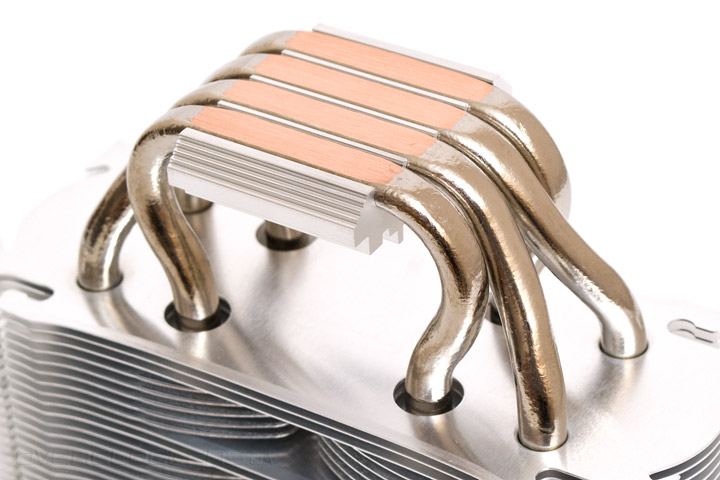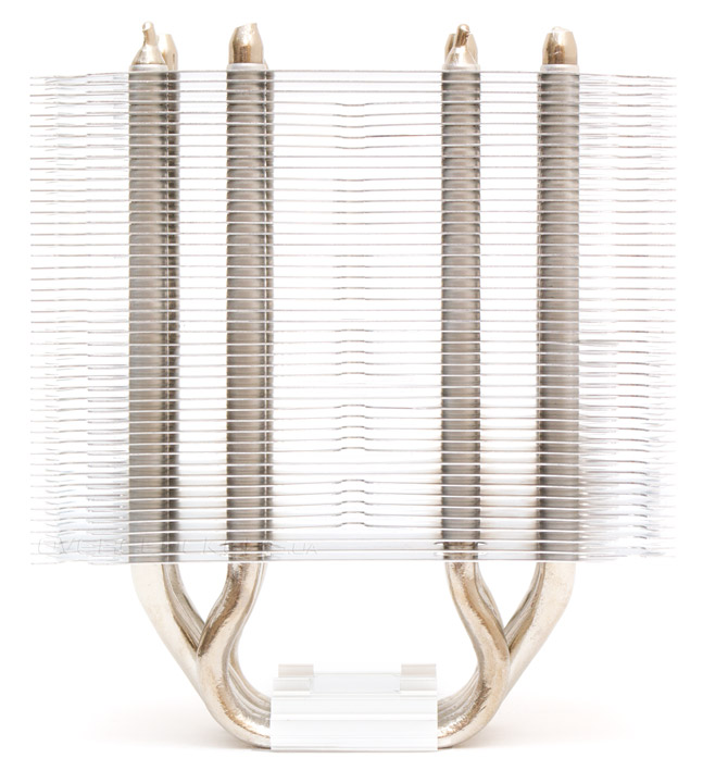Радиатор состоит из 46 пластин, напрессованных без видимых следов пайки на четыре тепловые трубки, расположенных U-образно. Суммарная площадь рассеивания составляет 6600 см². Тепловые каналы собраны по четыре с двух сторон в виде квадрата, то есть, распределены оптимально с точки зрения уменьшения противодействия воздушному потоку. Крайние тепловые трубки (если смотреть на подошву), попадающие в относительно прохладную зону крышки процессора, изогнуты полукругом и поставлены ближе к центру радиатора, где скорость воздушного потока меньше. А две центральные трубки, пролегающие через самую горячую зону крышки, расставлены по краям. С инженерной точки зрения, такая конструкция близка к идеалу.