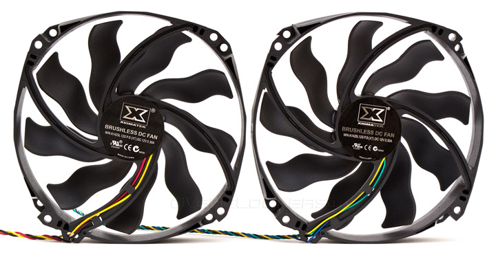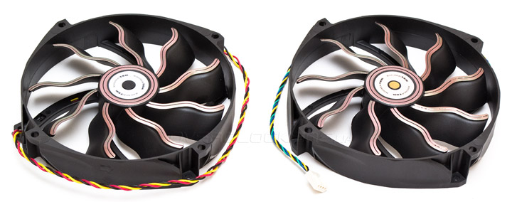 В комплекте с Xigmatek Prime используются необычные по внешнему виду 140-мм вентиляторы из серии XAF, с которыми мы уже однажды сталкивались. Волнообразная ступенчатая форма крыльчатки, с девятью лопастями и большим углом атаки, теоретически должна обеспечивать хорошие показатели, как по статическому давлению, так и по объему воздушного потока. Посадочные отверстия здесь заимствованы от 120-мм моделей. Но самое интересное то, что один из вентиляторов является трехконтактным (на картинке это левый) и не имеет ШИМ-управления скоростью вращения, а второй — черехконтактным с ШИМ. Таким образом, регулировать их синхронно довольно проблематично. Длина шнуров питания обеих моделей — 300 мм.