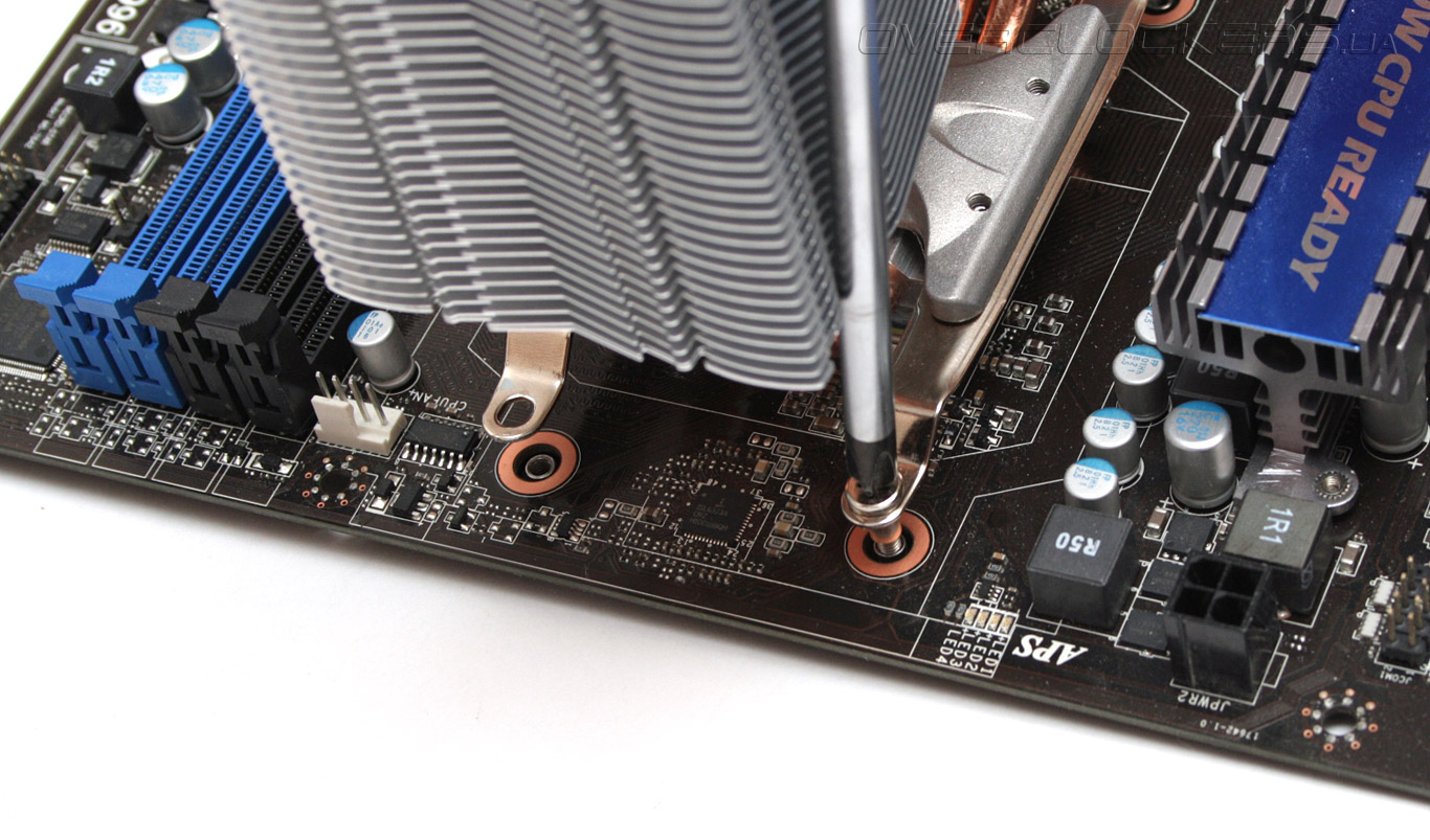 Затем, установив радиатор на материнскую плату, необходимо зафиксировать его винтами.