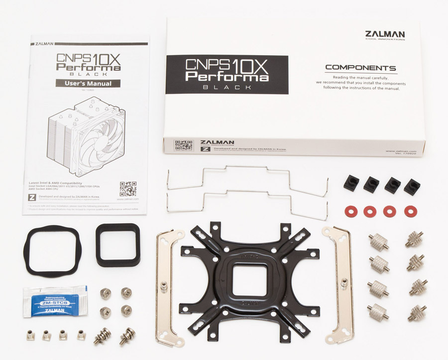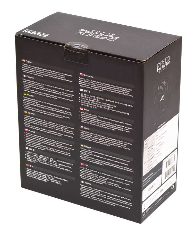 Модель Zalman CNPS10X Performa Black отличается красивой черной окраской всего радиатора за исключением основания. Причем, это не обычная порошковая покраска, а нанесение краски с помощью электрофореза, благодаря чему она держится крепче, выглядит лучше и минимально мешает передаче тепла. Ширина устройства равняется 135 мм, а высота, с максимально опущенным вниз вентилятором, — 155 мм.