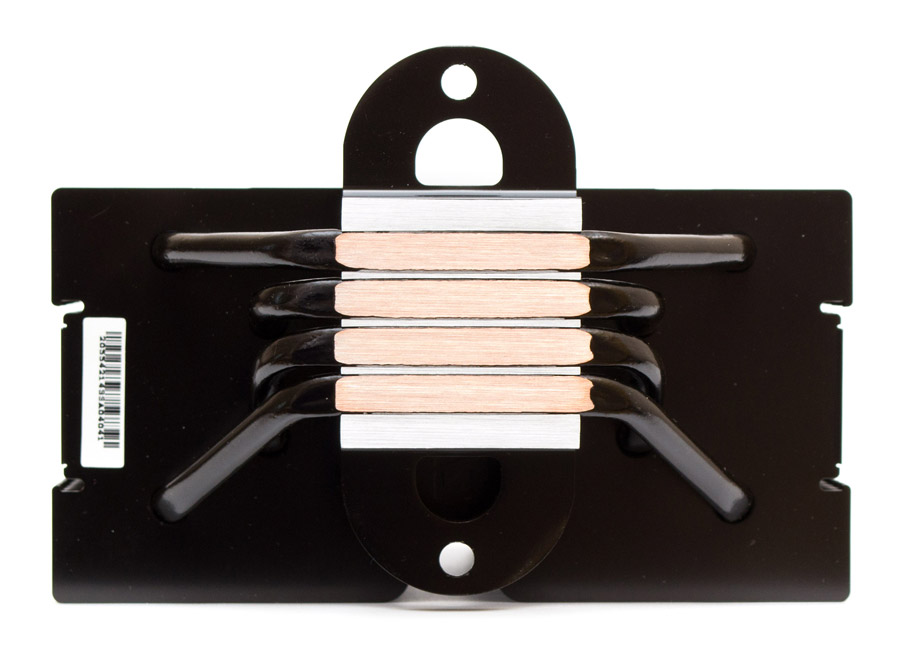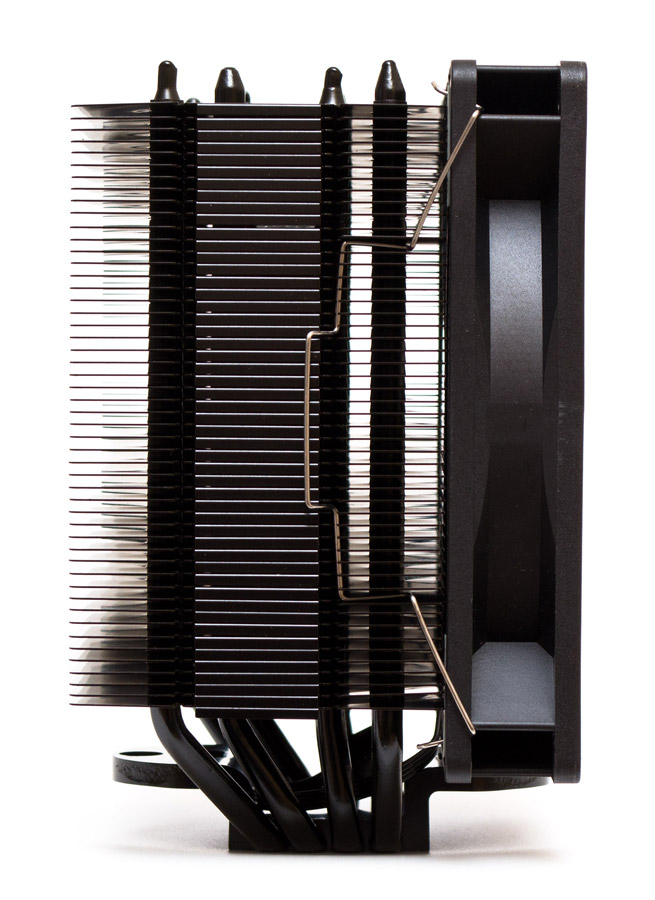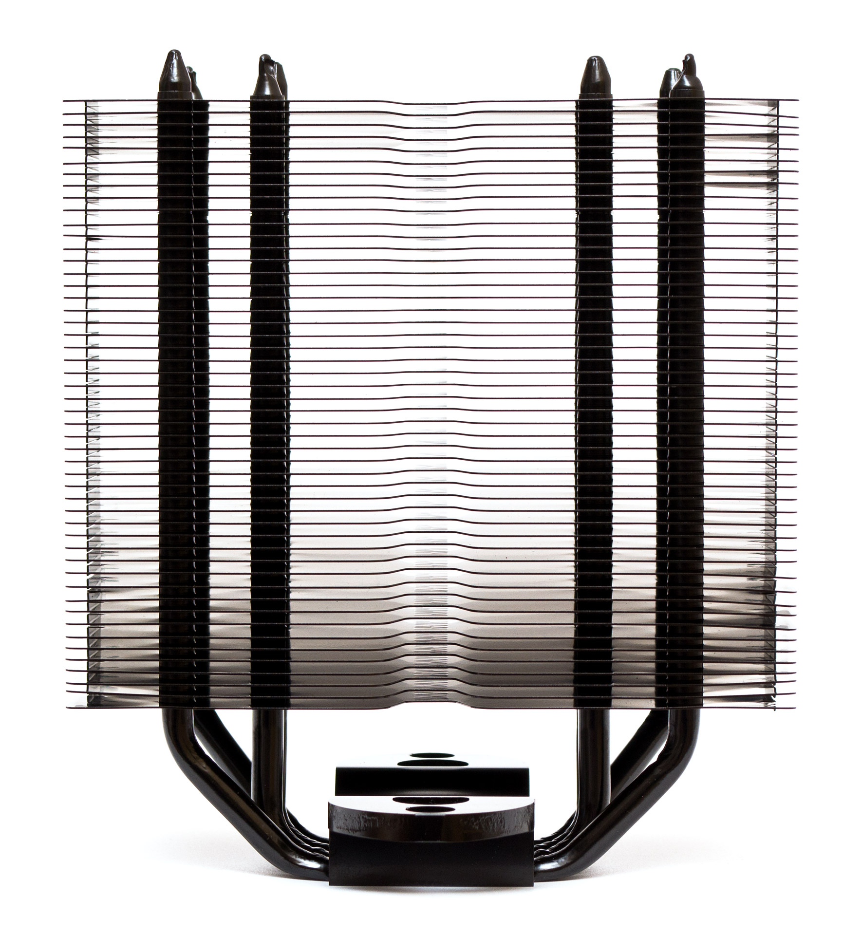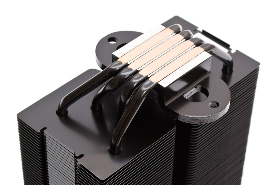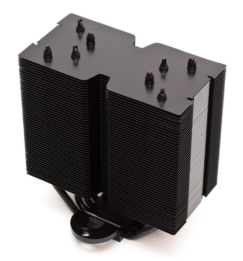 Тело радиатора состоит из четырех медных 6-мм тепловых трубок и 50 ребер, расположенных с зазором в 1,9 мм. Суммарная площадь рассеивания тепла составляет 9271 см2, что почти на треть больше, чем у прошлой итерации Performa и дотягивается уже до уровня двухбашенных моделей. Тепловые трубки разведены U-образно по четыре штуки в каждую сторону, в виде трапеции.