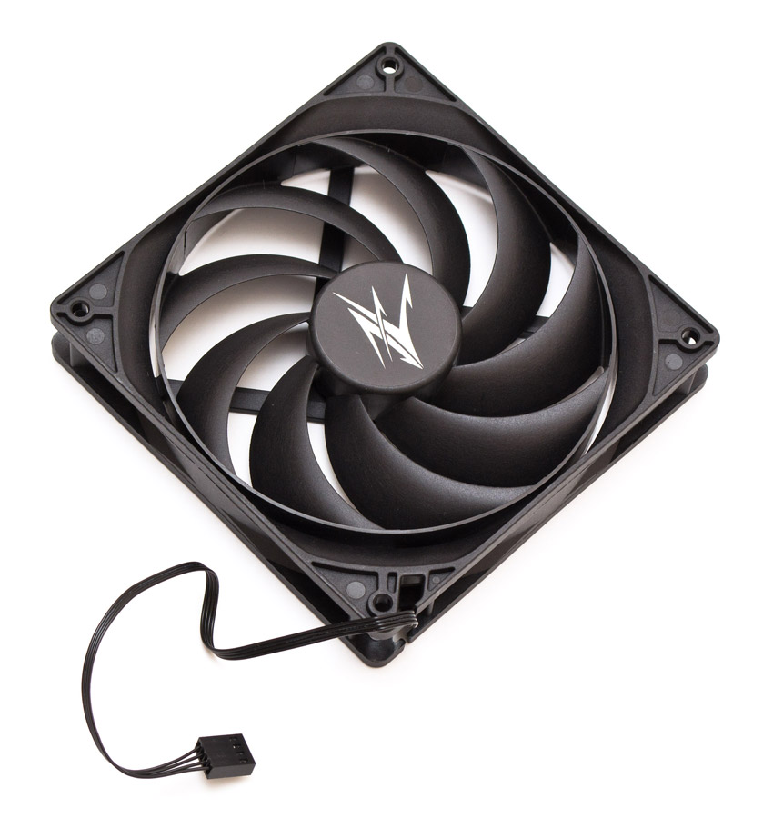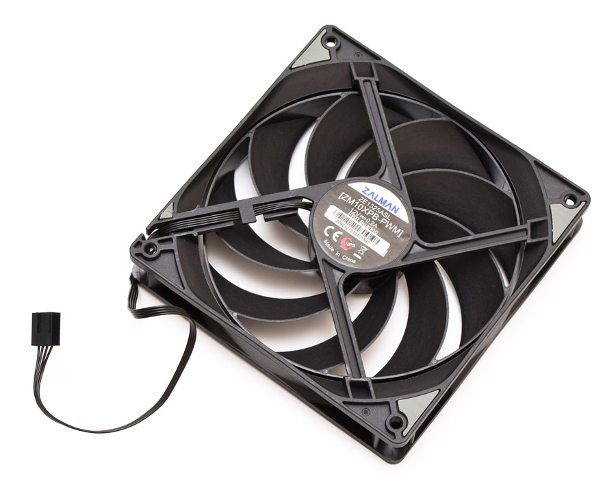 Комплектный вентилятор весьма нестандартный. Во-первых, он имеет размер 135х135х25 мм. Во-вторых, размер квадрата посадочных отверстий здесь равен 120х120 мм. Для справки: в случае 120-мм вентилятора этот параметр равен 105х105 мм, для стандартного 140-мм пропеллера — 125х125 мм. Крыльчатка имеет девять изогнутых лопастей. На концах их граней установлена кольцевая пластина, которая, с одной стороны, позволяет сделать воздушный поток более концентрированным (не давая уходить ему в зазор возле рамки), а с другой — исполняет роль маховика и балансира для лопастей. Доступный диапазон скоростей регулируется при помощи ШИМ в пределах от 700 до 1500 об/мин. Уровни шума достаточно приемлемые: около 40 дБ (А) при 950 об/мин (не слышно из закрытого корпуса) и не более 52 дБ (А) при 1550 об/мин на радиаторе. В качестве подшипника заявлен EBR, представляющий собой улучшенную за счет защиты от пыли втулку скольжения. Посторонних шумов и паразитных призвуков у пропеллера нет. С обратной стороны рамки наклеены миниатюрные резиновые демпферы вибрации, серого цвета. Разъем питания на четыре контакта находится на коротком шнуре без оплетки.