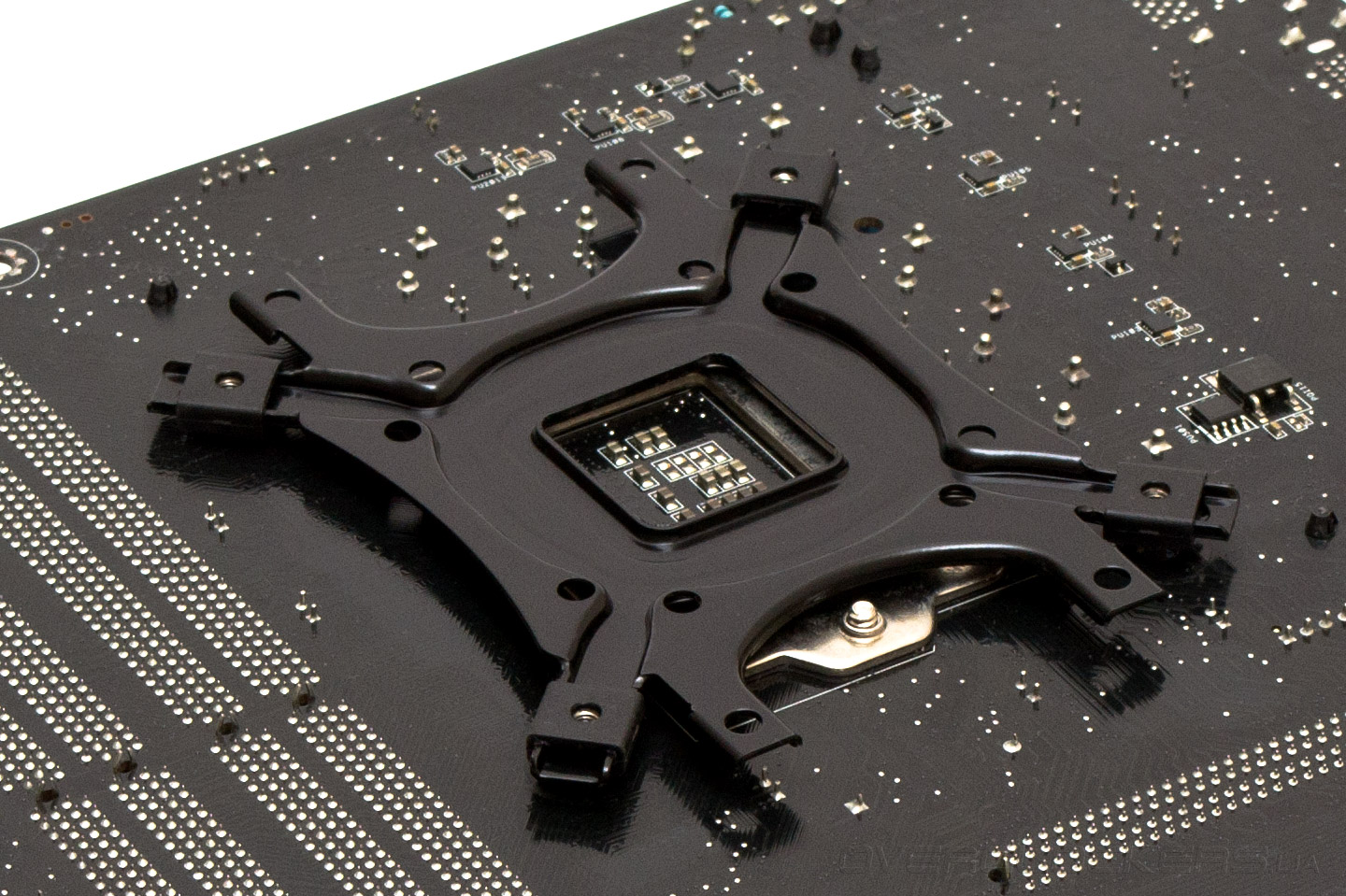 Прикладываем собранную усилительную пластину к обратной стороне материнской платы. Либо, если монтаж происходит на столе, кладем плату на пластину, совмещая крепежные отверстия с обоймами.