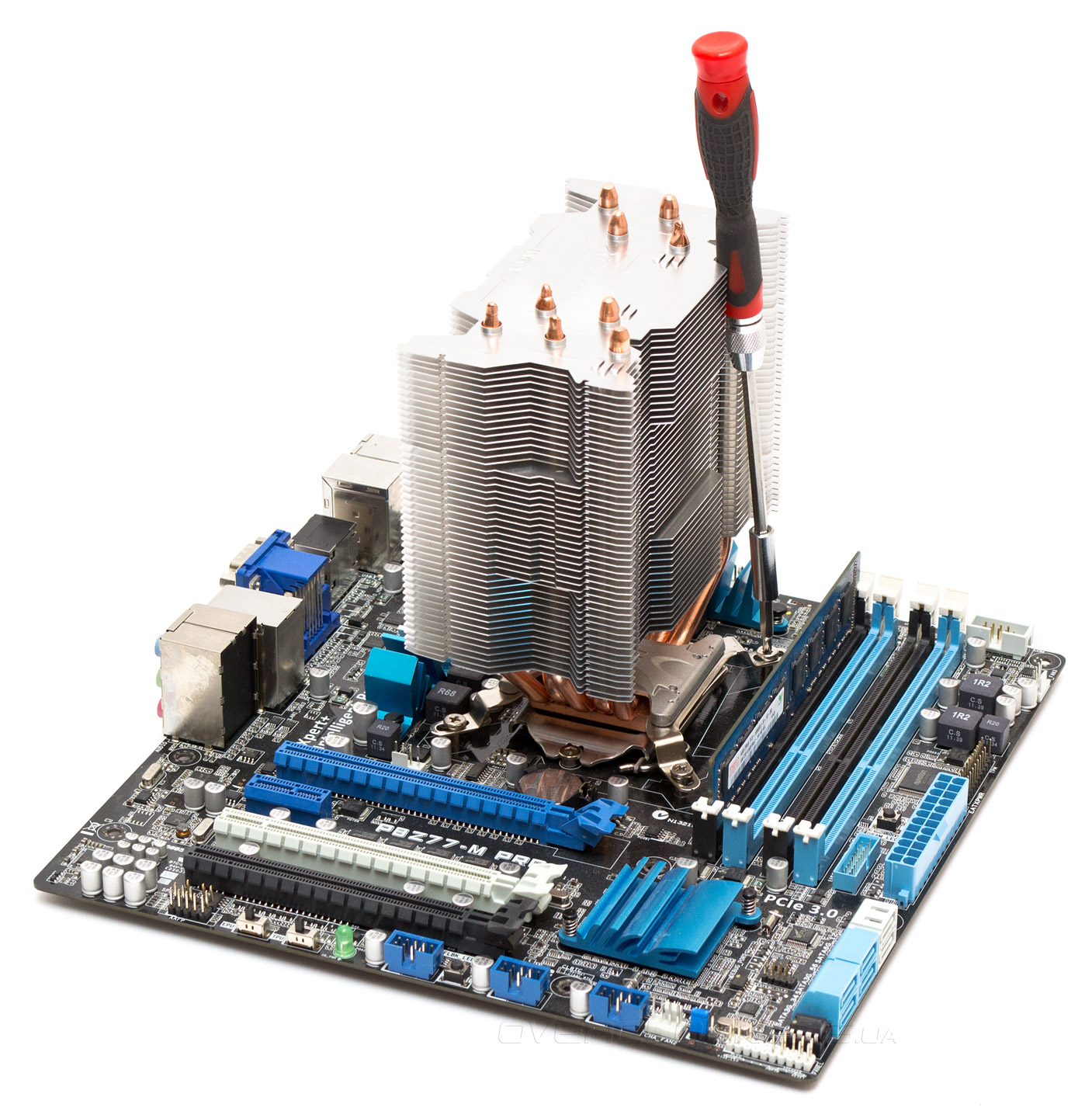 Наносим термоинтерфейс на центр крышки процессора и прижимаем его кулером сверху. Размазывать ничего не требуется, паста сама распределится, как следует. Используя крестовые винты, закрепляем кулер на месте. В прошлой ревизии винты были шестигранными, с внутренней резьбой. Даже с применением комплектной отвертки, грани в них быстро «слизывались» и винт становился непригодным для дальнейшего использования. Сейчас же это исправили.