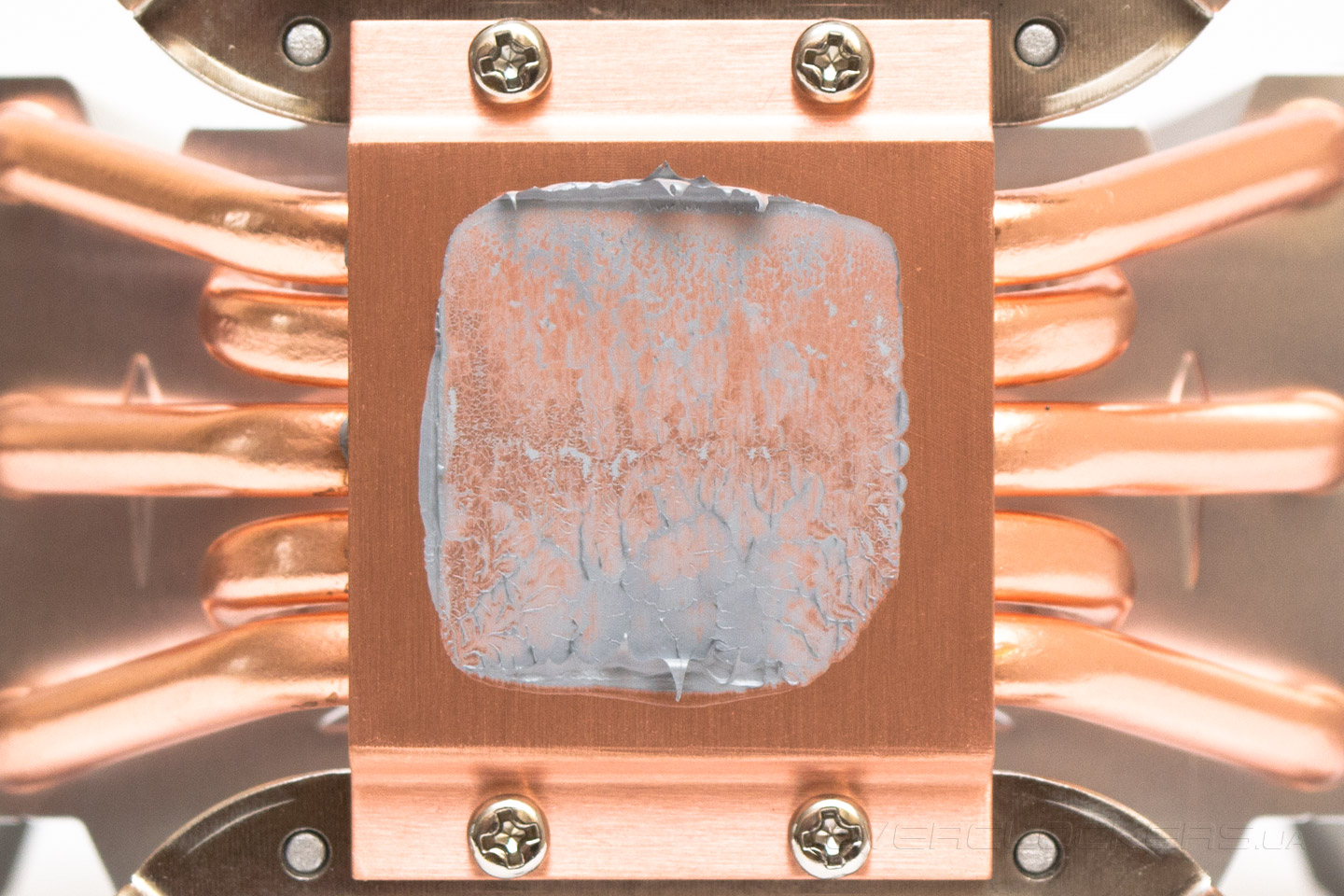 Отпечаток термоинтерфейса на основании кулера говорит о его относительной ровности и высокой силе прижима. Как видим, в зону соприкосновения с крышкой процессора попадают три центральные тепловые трубки, в то время как боковые задействованы лишь наполовину.