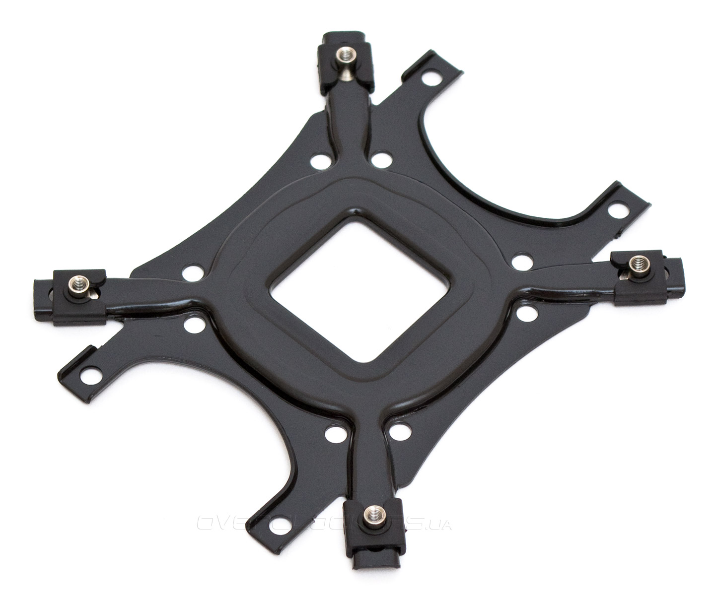 Монтаж процессорного кулера Zalman CNPS11X Performa+ будет продемонстрирован на примере разъема Intel LGA1155. Его система крепления практически не претерпела изменений в сравнении со старой моделью, не считая удачного решения с использованием стандартных крестовых винтов. Процесс начинается со сборки усилительной пластины. Выбираем для нее правильное положение (одна сторона для Intel, а вторая — для AMD). Затем вставляем крепежные втулки в нужные отверстия и фиксируем их пластиковыми стопорами. Опционально можно приклеить липкий квадратик по центру, для поддержки пластины, но я этого делать не рекомендую, поскольку отодрать его от обратной стороны материнской платы будет проблематично.