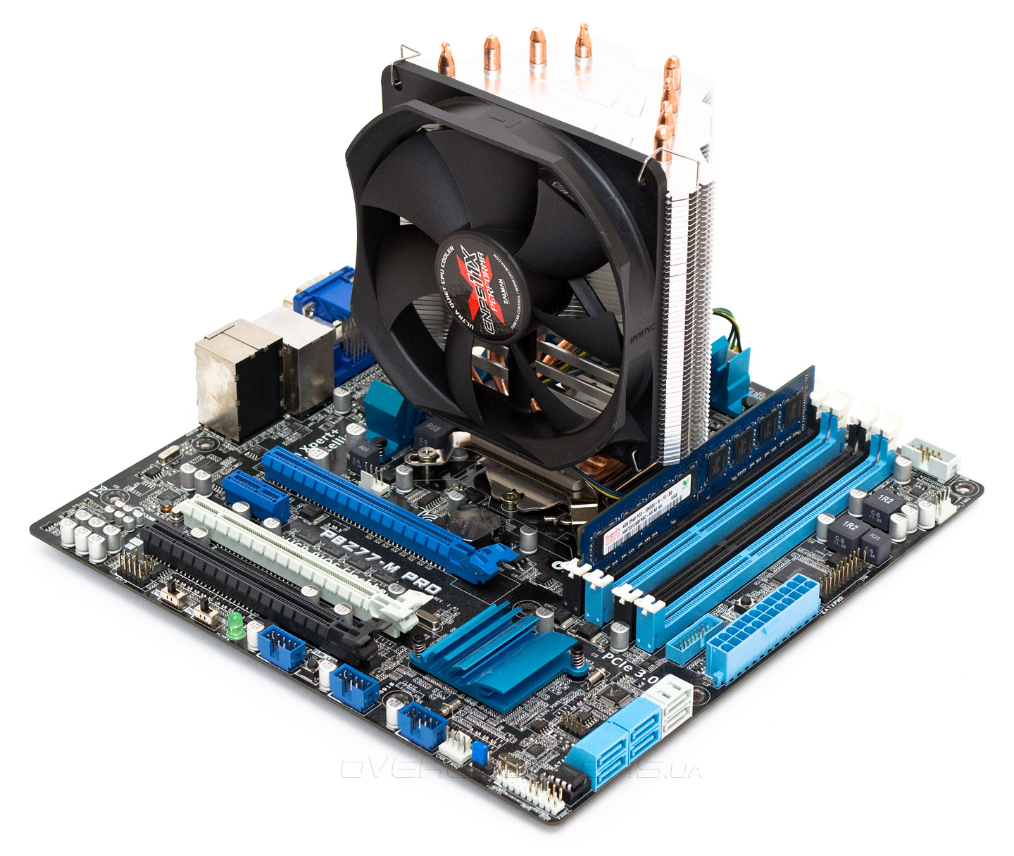 | Материал радиатора и конструкция | V-образная двухсекционная конструкция из алюминиевых пластин, нанизанных на 4 медных тепловых трубки с основанием прямого контакта | Конструкция из алюминиевых пластин, нанизанных на 5 медных тепловых трубок диаметром 6 мм, расставленных U-образно. Тепловые трубки соединены с медным основанием. |