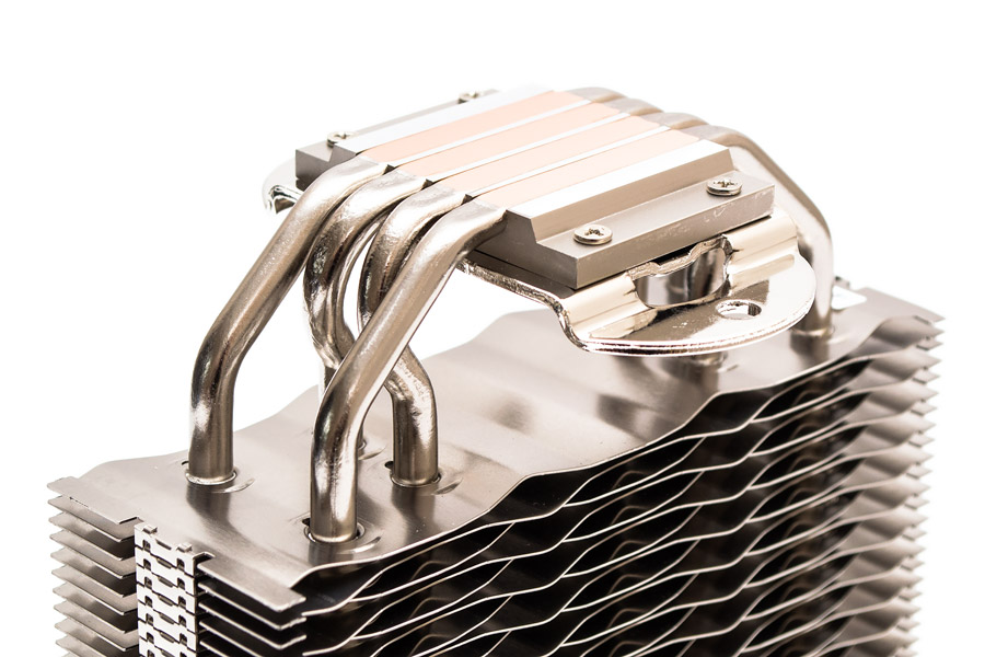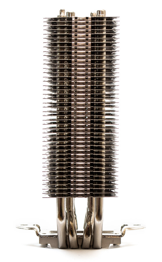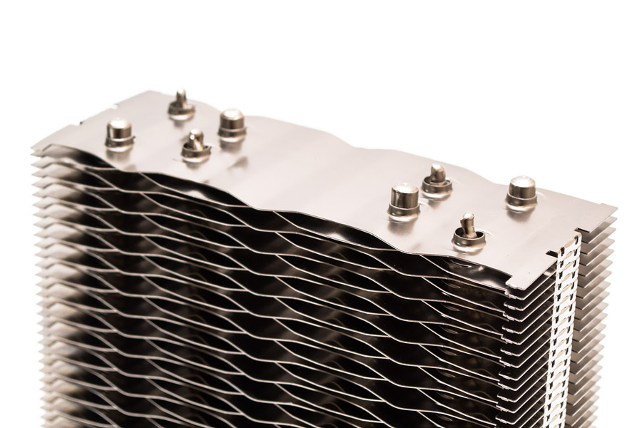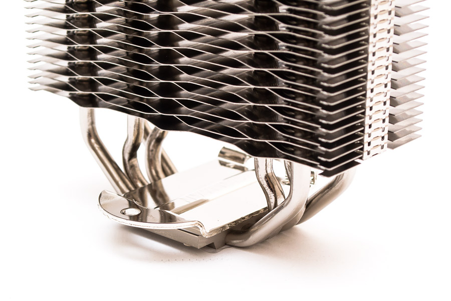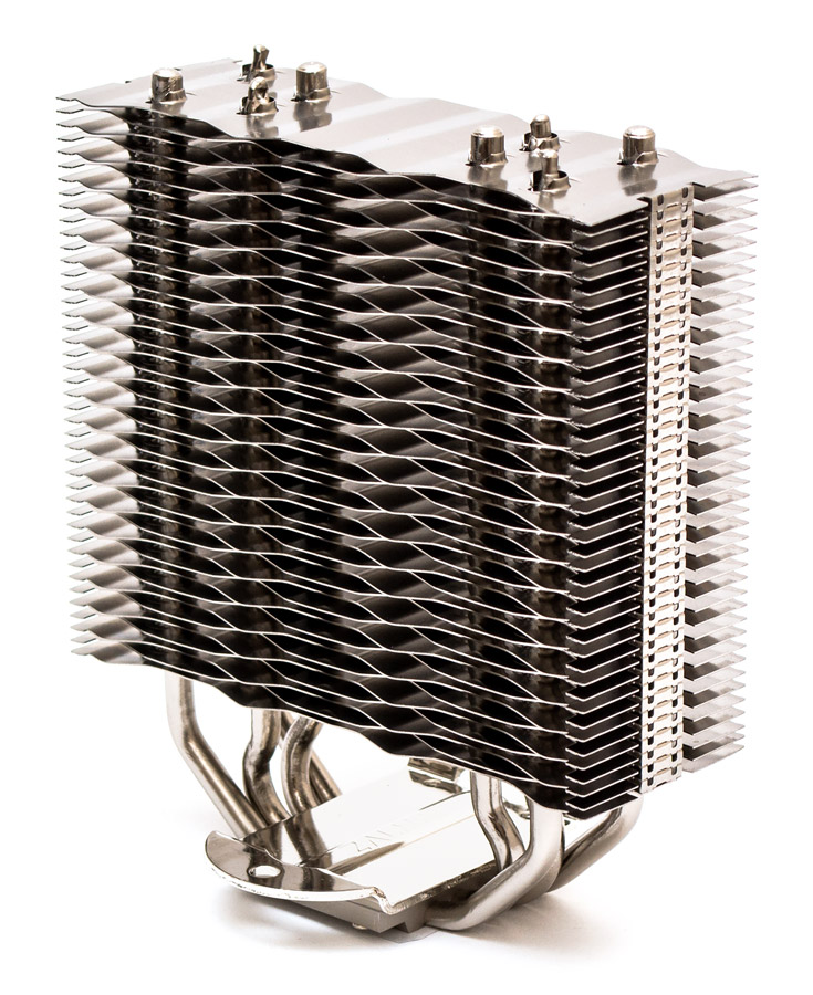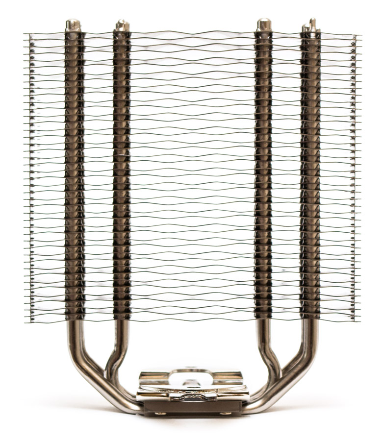 Тело радиатора состоит из 43 волнообразных пластин, через которые проходит четыре 6-мм медные тепловые трубки, собранные в два ряда по две штуки в каждом. Трубки расположены в форме трапеции (если смотреть сверху), аналогичная схема была у кулера Zalman CNPS10X Optima. Из-за изгиба ребер зазор между ними колеблется в пределах от 1 до 4,5 мм, образуя отдельные воздушные каналы. Суммарная площадь рассеивания тепла составляет 5 177 см². Высота радиатора равна 158 мм, а ширина — 132 мм.