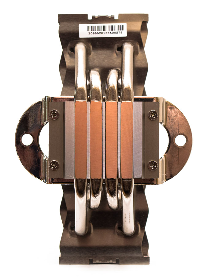 | Материал радиатора и конструкция | Конструкция из алюминиевых пластин, нанизанных на 4 медные тепловые трубки диаметром 6 мм, расположенных U-образно. Тепловые трубки имеют медное основание прямого контакта. Вся остальная конструкция никелирована | Конструкция из алюминиевых пластин, нанизанных на 5 медных тепловых трубок диаметром 6 мм, расставленных U-образно. Тепловые трубки соединены с медным основанием |