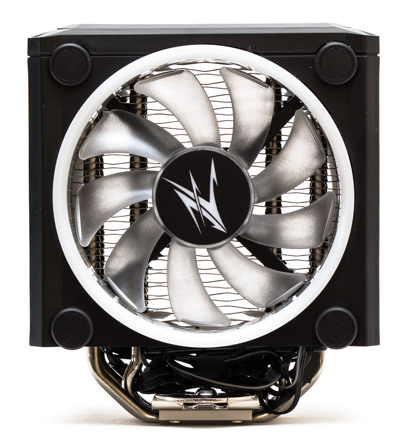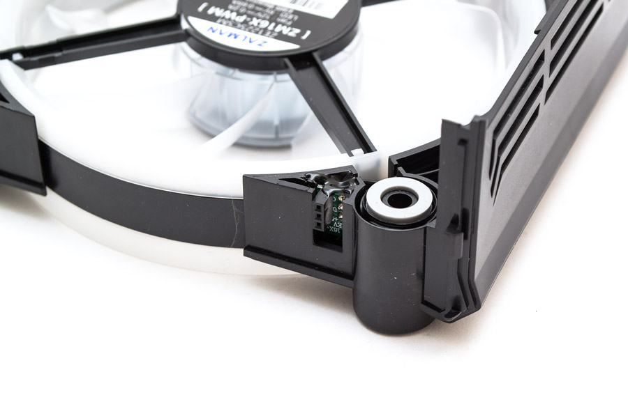 Комплектные вентиляторы состоят из передней и задней части. Оба намертво закреплены в боковых пластиковых направляющих, которые служат как для декоративных целей, так и для крепления пропеллеров на радиатор. Рамка пропеллеров нестандартная, округлой формы с круглыми боковыми креплениями, держащимися на цилиндрических выступах. Светодиоды в ней расположены в полупрозрачном кольце по периметру, в количестве 18 штук. Передний вентилятор промаркирован как ZE-1225CSM (ZM16X PWM). В нем заявлено использование EBR-подшипника со сроком наработки на отказ в 50 тыс. часов. По своей сути это вариация на тему втулки скольжения со слегка улучшенной защитой от попадания пыли. Диапазон скоростей регулируется при помощи ШИМ в пределах от 800 до 1500 об/мин. Вентилятор довольно тихий и без посторонних призвуков. Кабелей подключения есть три. Первый из них предназначен для подсветки крышки кулера, его длина равна 680 мм. Второй отвечает за подсветку вентилятора. Это тоже стандартный +5VDG, длиной в 420 мм. Третий — это питание вентилятора на четыре контакта.